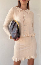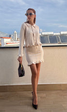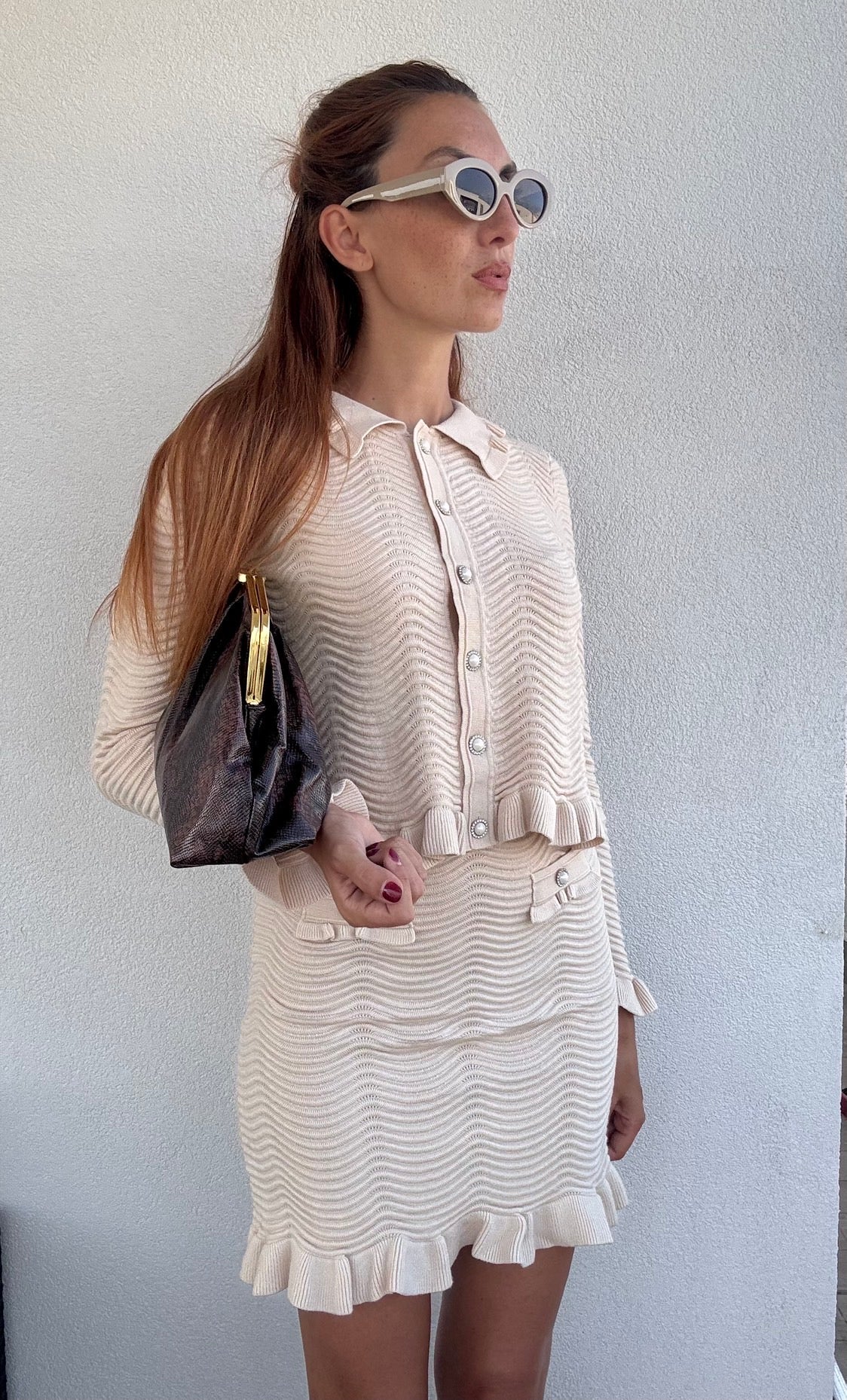 Questo coordinato Caroline in misto viscosa unisce eleganza e comfort grazie alle delicate ruches che ne impreziosiscono il design. La gonnellina a vita alta valorizza la silhouette, mentre il cardigan con bottoncini decorati da perle aggiunge un tocco raffinato e femminile. Taglia unica, versatile e adatta fino a una L, perfetta per chi cerca uno stile sofisticato e pratico in ogni occasione.