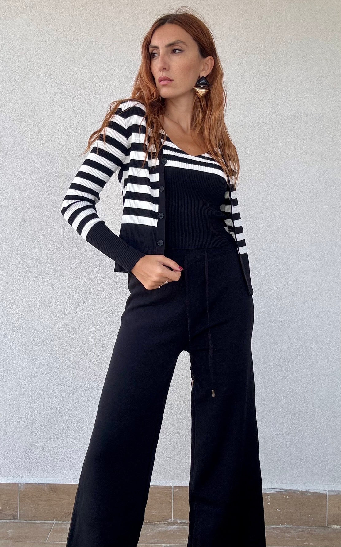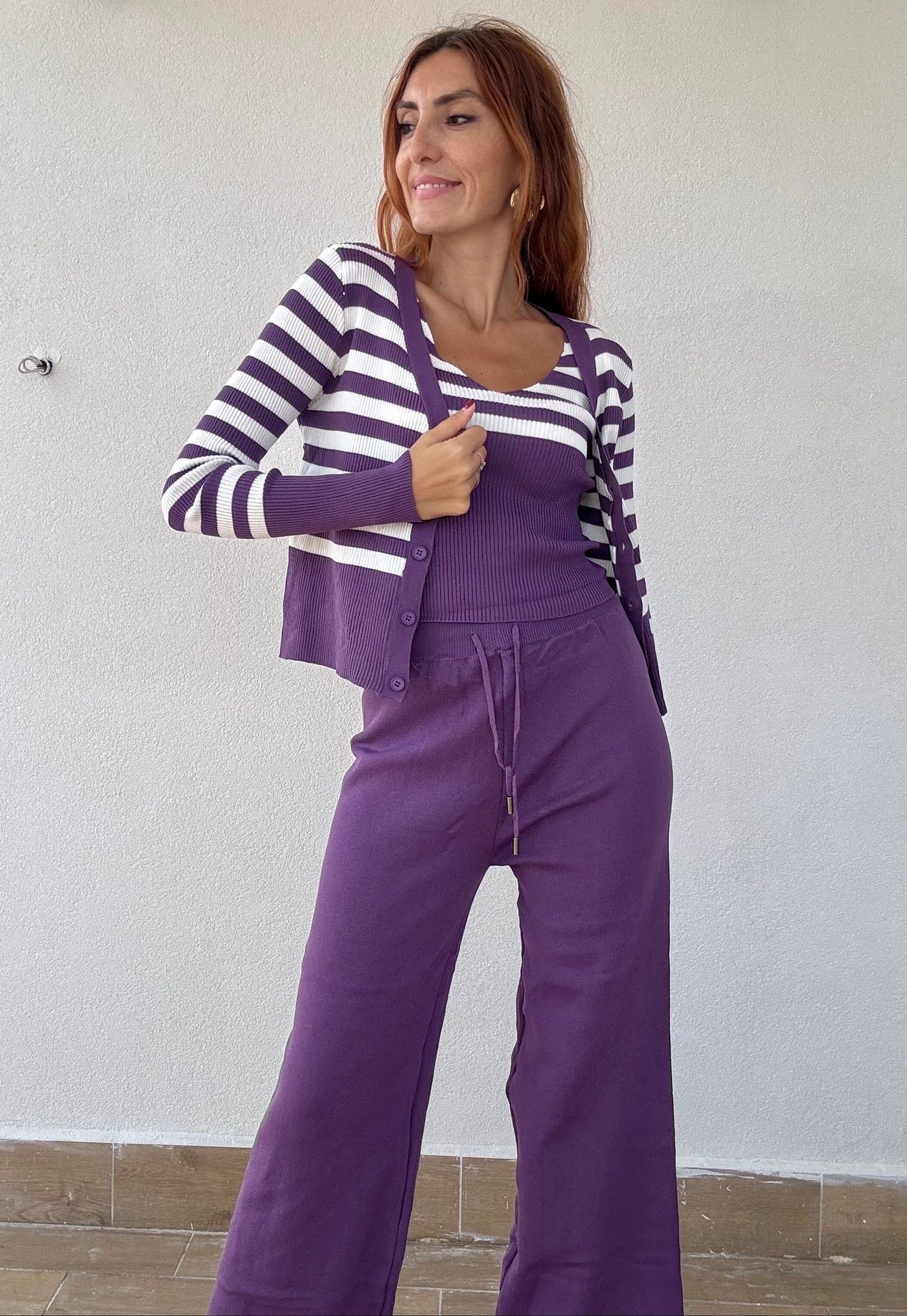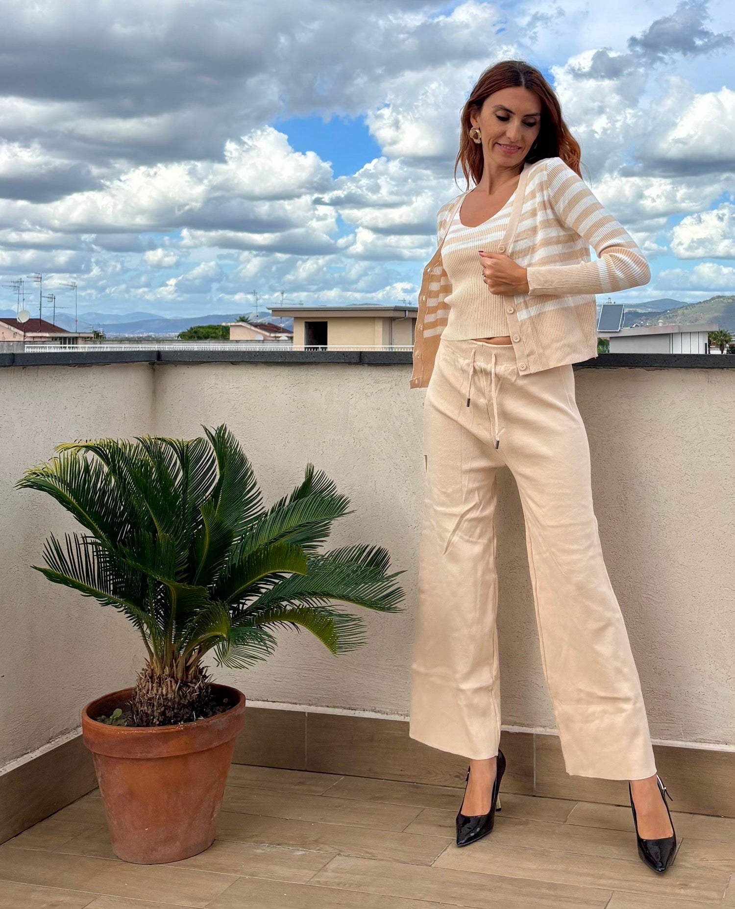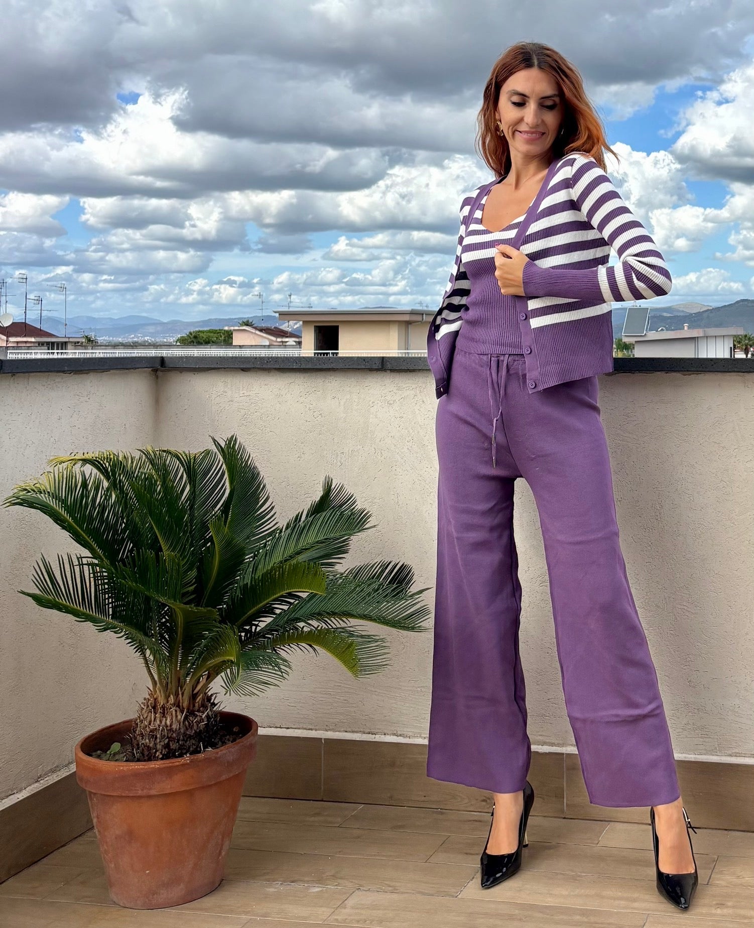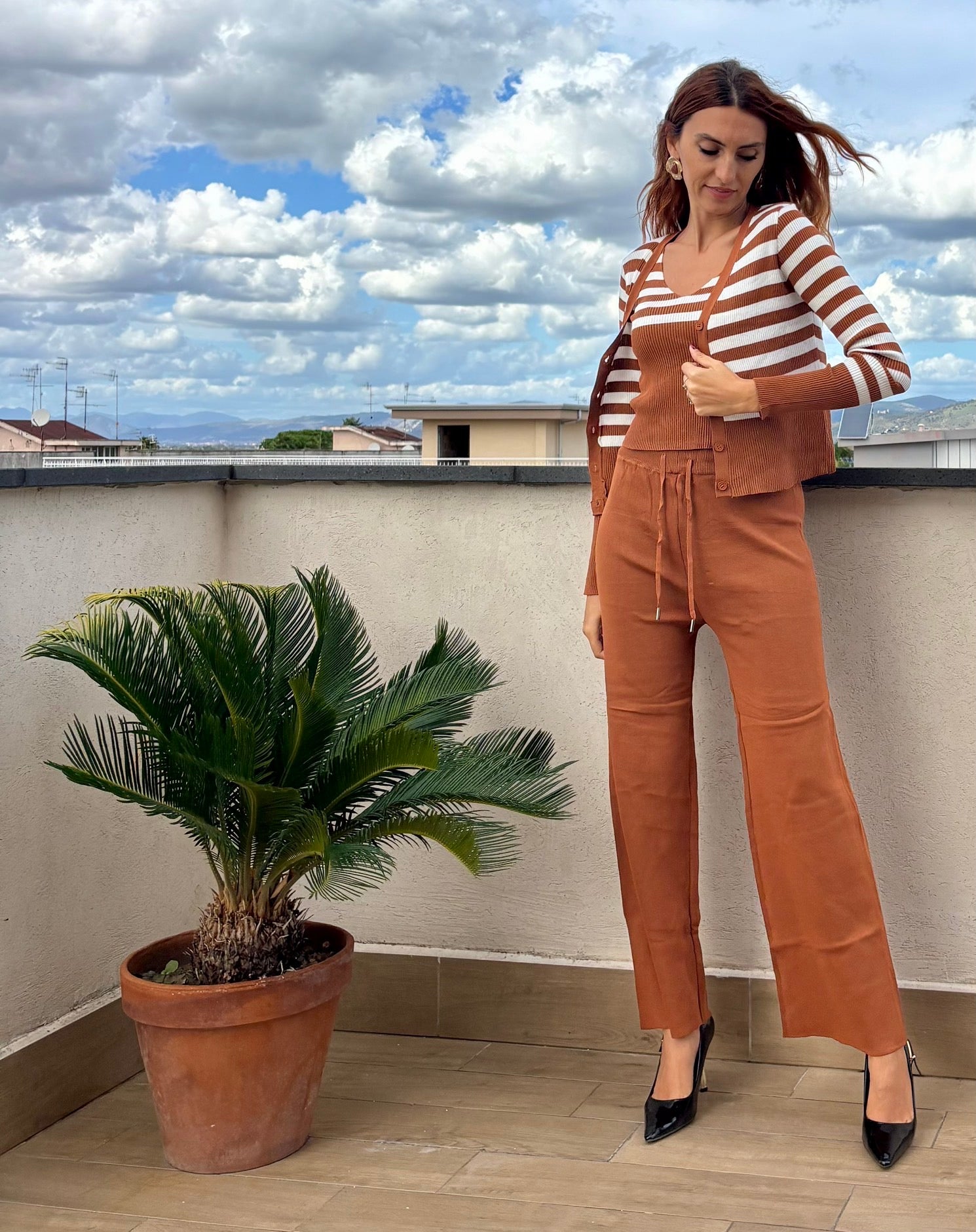 Il coordinato Elettra unisce comfort e stile in un set tre pezzi: pantalone a vita alta un fondo, top e cardigan a righe. Realizzato in morbido cotone 65%, è perfetto per chi cerca una vestibilità comoda ed elegante, adattandosi facilmente anche a una taglia L. Disponibile in cinque colori vibranti, questo outfit versatile valorizza ogni occasione con un tocco di classe e praticità. Scegli Elettra per un look coordinato senza rinunciare al comfort.
