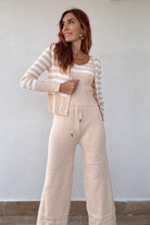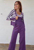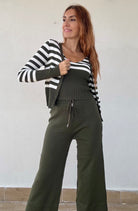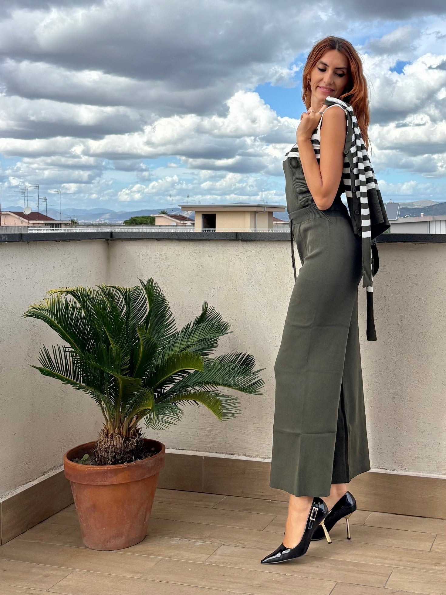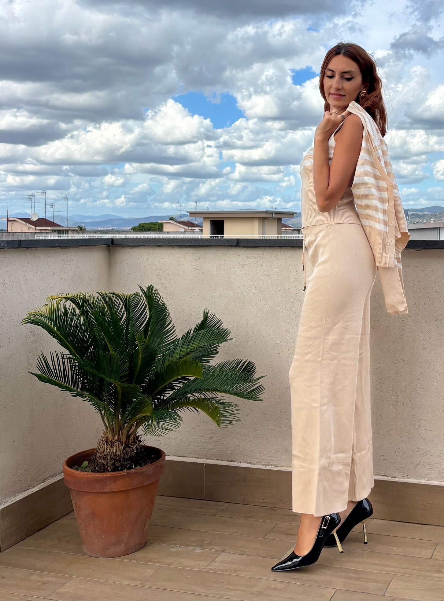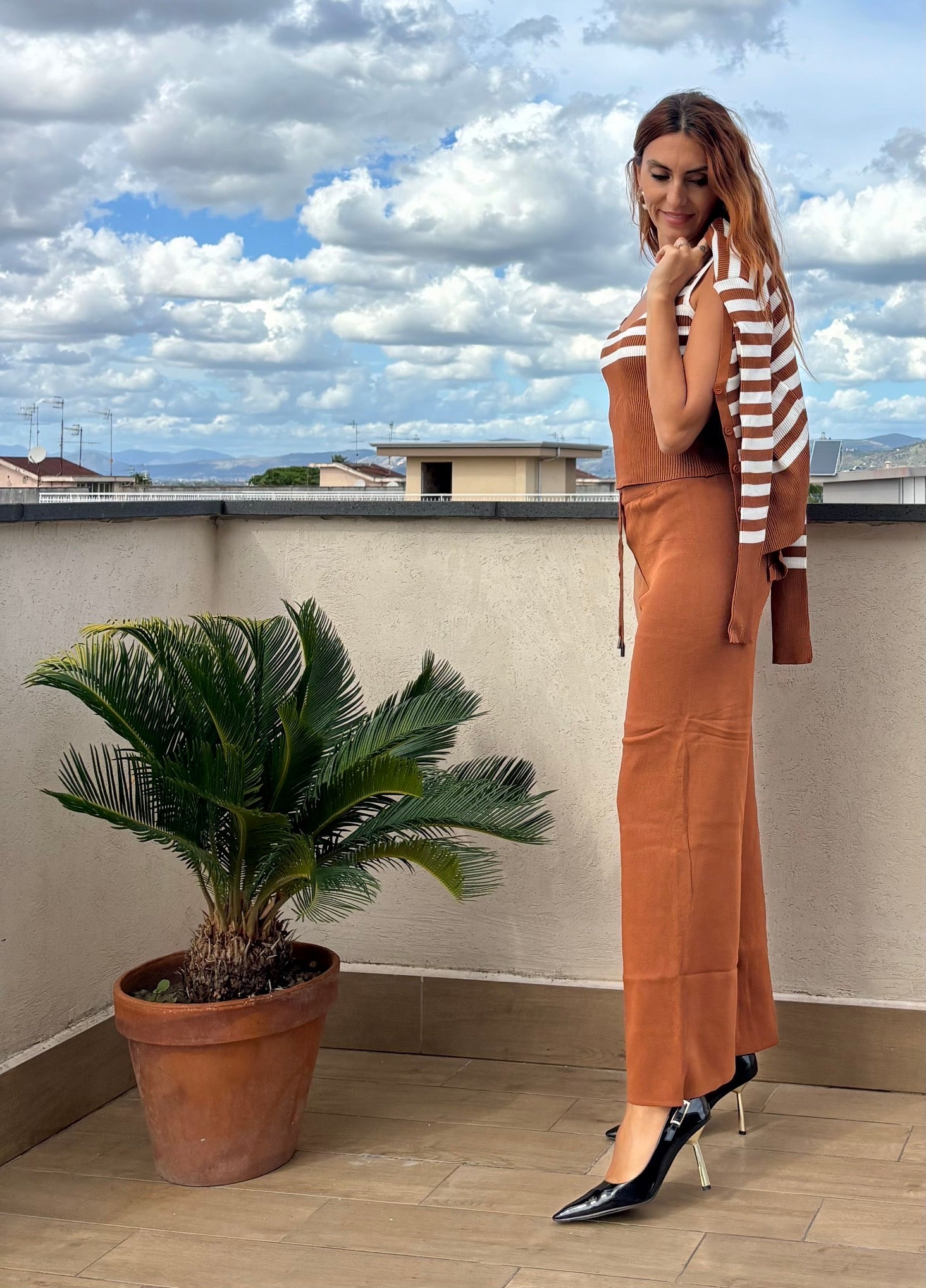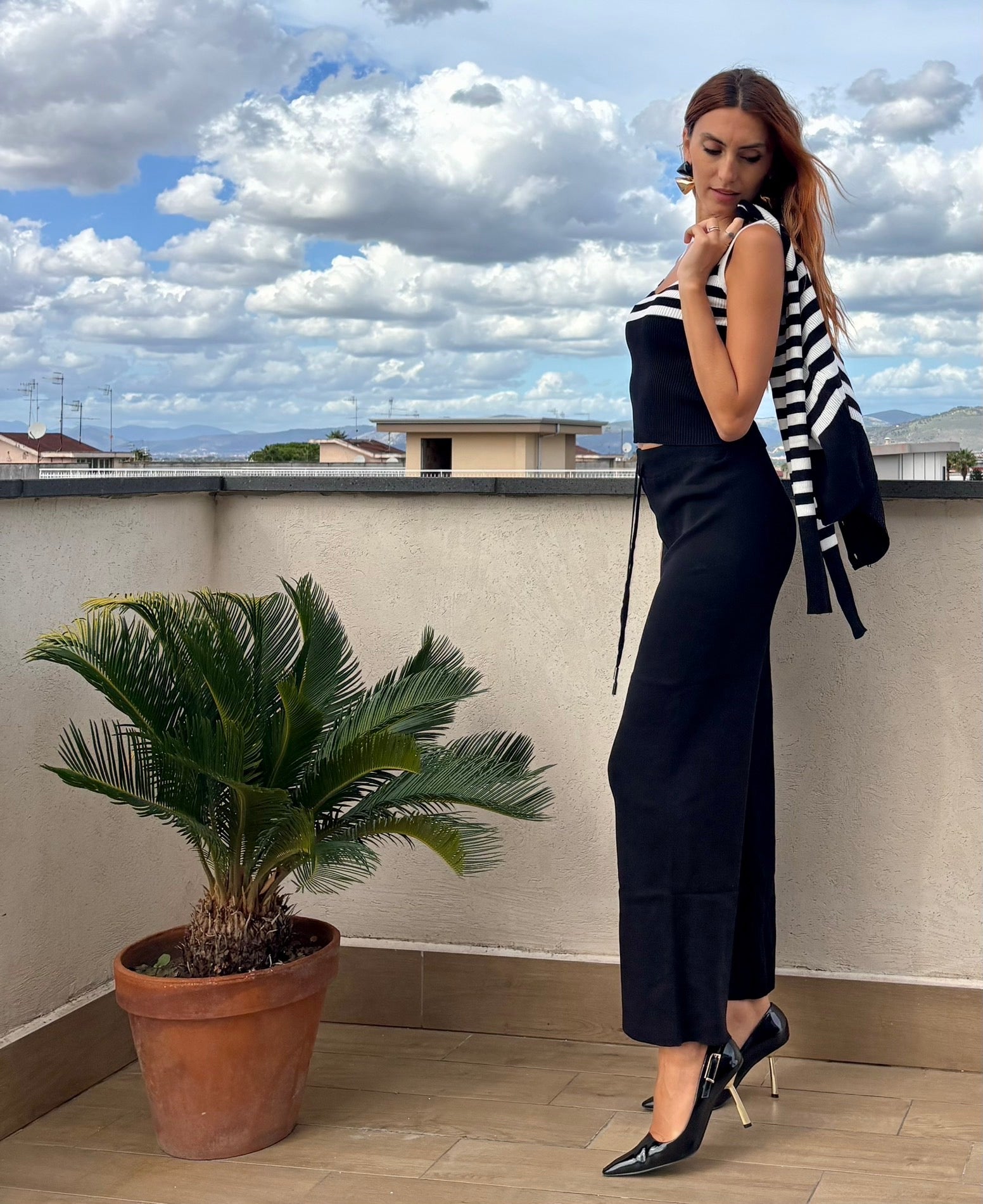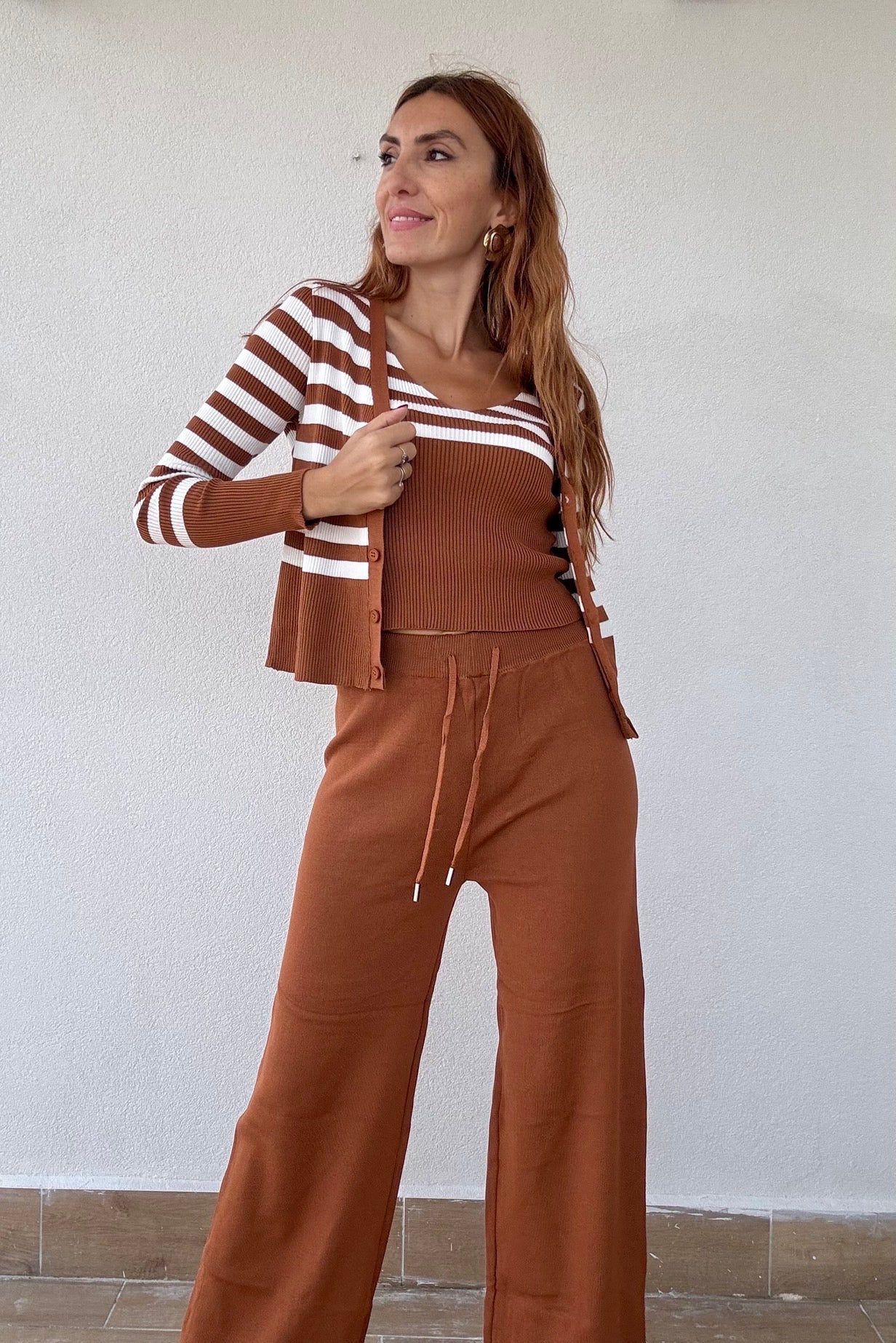 Il coordinato Elettra unisce comfort e stile in un set tre pezzi: pantalone a vita alta un fondo, top e cardigan a righe. Realizzato in morbido cotone 65%, è perfetto per chi cerca una vestibilità comoda ed elegante, adattandosi facilmente anche a una taglia L. Disponibile in cinque colori vibranti, questo outfit versatile valorizza ogni occasione con un tocco di classe e praticità. Scegli Elettra per un look coordinato senza rinunciare al comfort.
