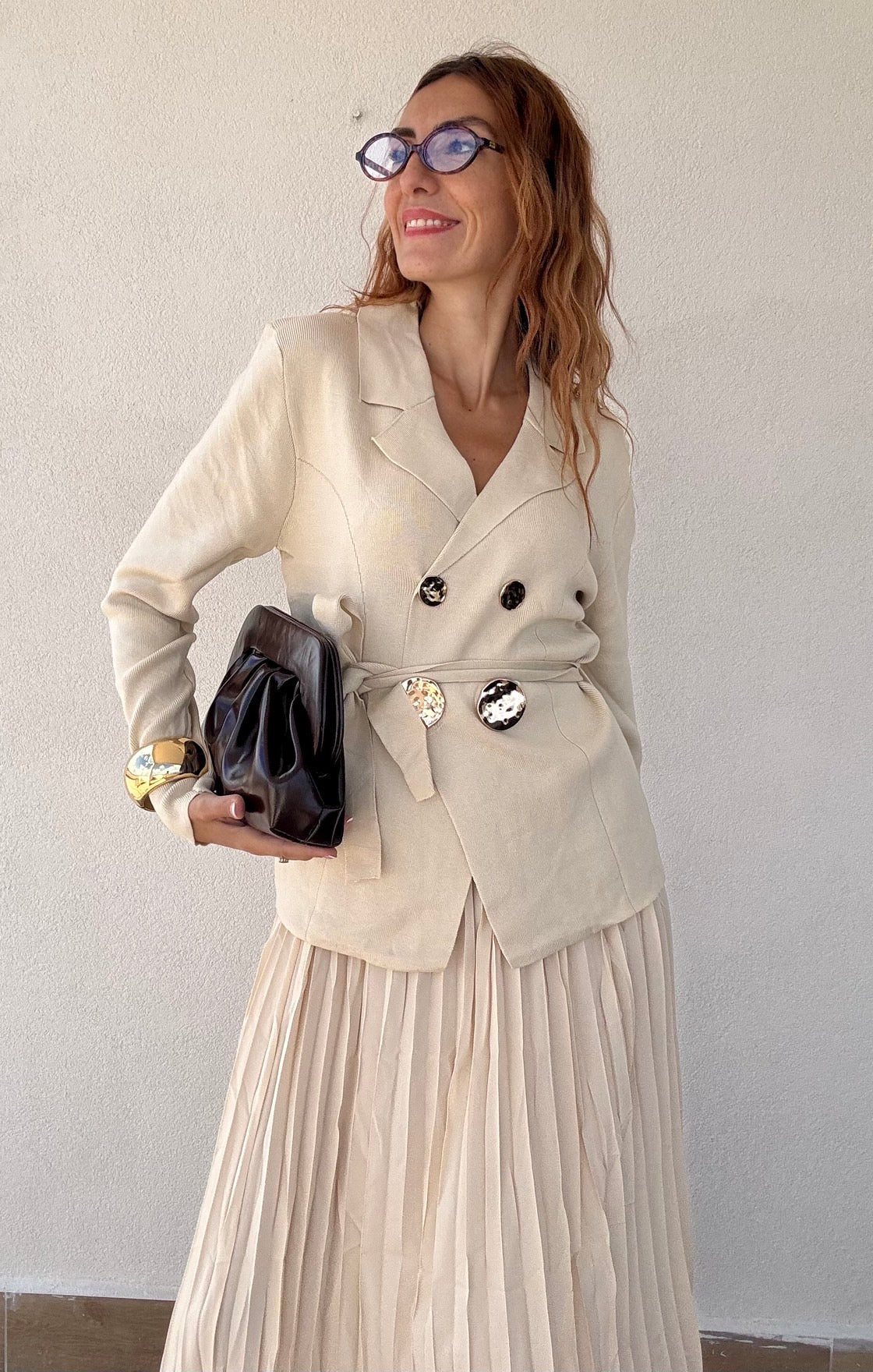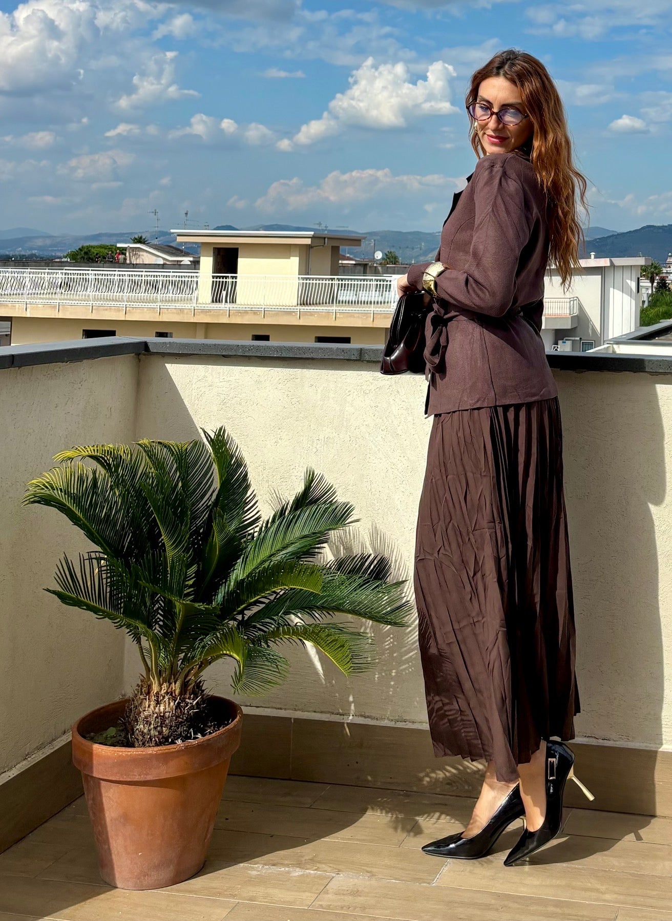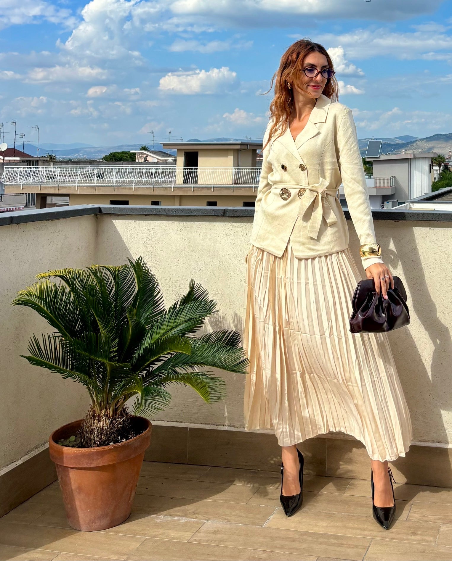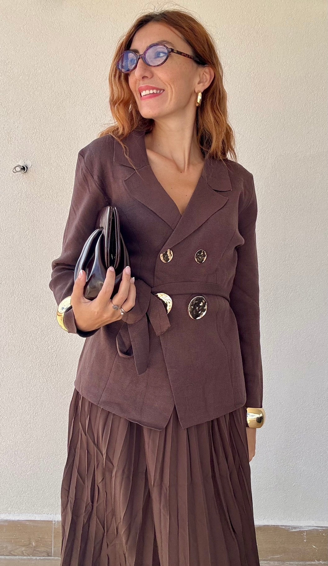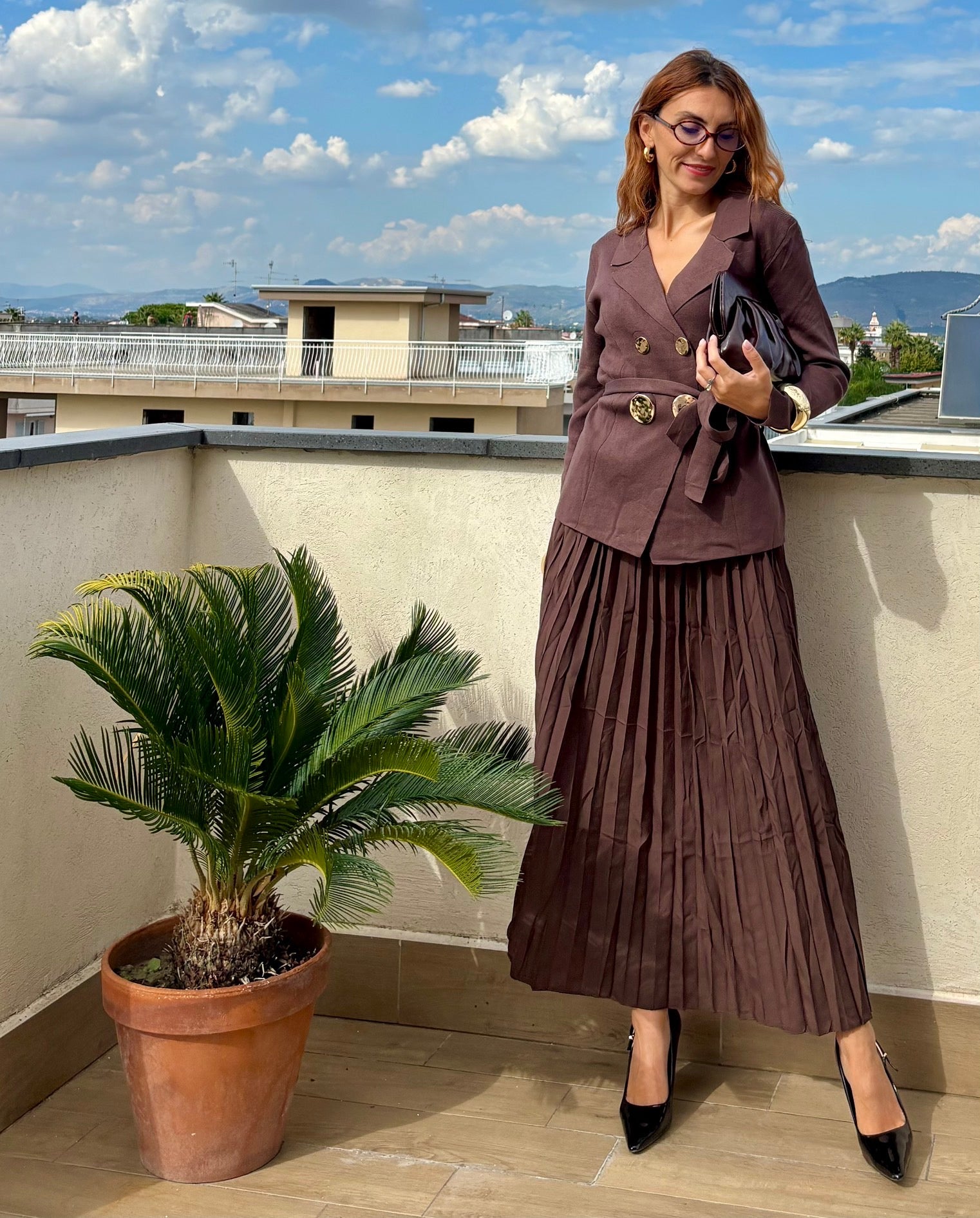 Completa il tuo guardaroba con il Coordinato Marbella, composto da un elegante gonnellone lungo plissettato e un cardigan dettagliato con bottoni dorati e cintura raffinata. La taglia unica si adatta comodamente fino a una L, garantendo vestibilità e stile senza compromessi. Disponibile in quattro colori versatili, questo set è perfetto per ogni occasione, unendo comfort e classe con facilità. 50% Viscosa-28% poliestere-22% Nylon