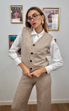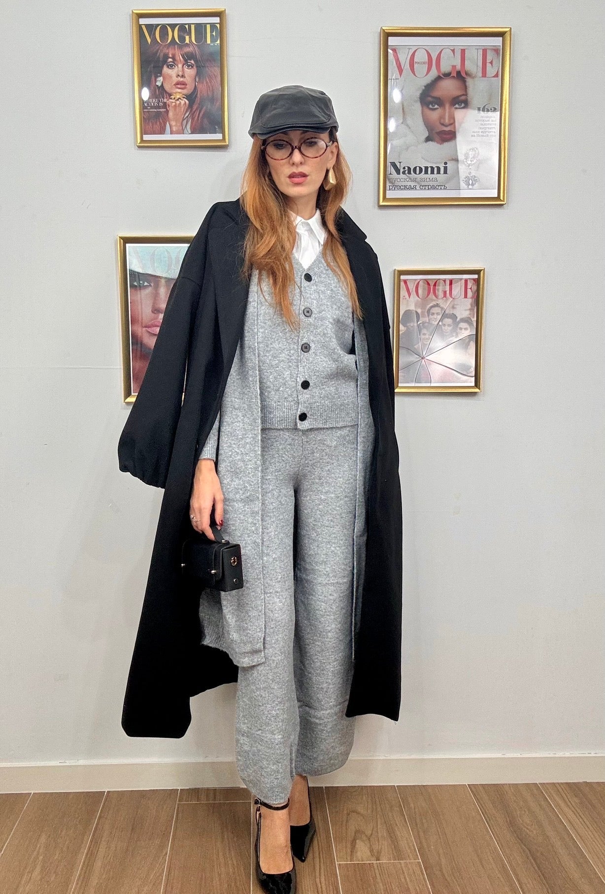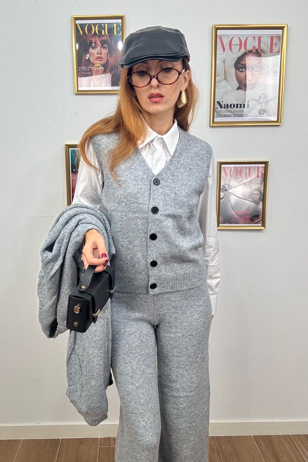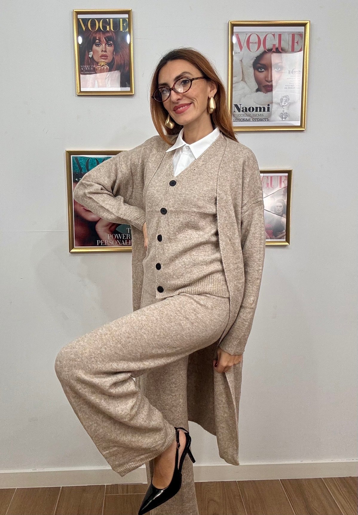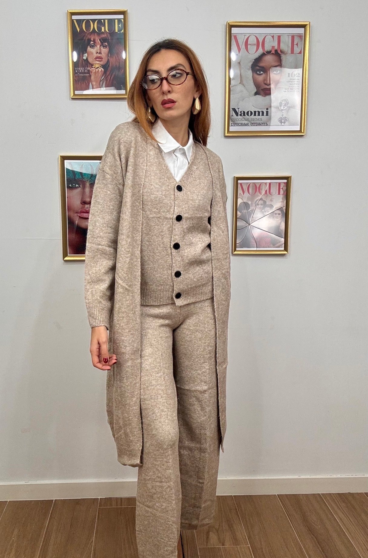 Scopri il coordinato Michelle, la soluzione perfetta per uno stile sofisticato e versatile. Questo elegante set da tre pezzi combina un pantalone, un gilet e un cardigan lungo, creando infinite possibilità di abbinamento per il tuo guardaroba. Realizzato in pregiato misto viscosa e acrilico, garantisce comfort e una caduta impeccabile. La taglia unica si adatta meravigliosamente anche a chi indossa una L, assicurando una vestibilità ideale. Disponibile in tre colori affascinanti, il coordinato Michelle è l'investimento che stavi cercando per elevare il tuo look quotidiano con eleganza senza sforzo.