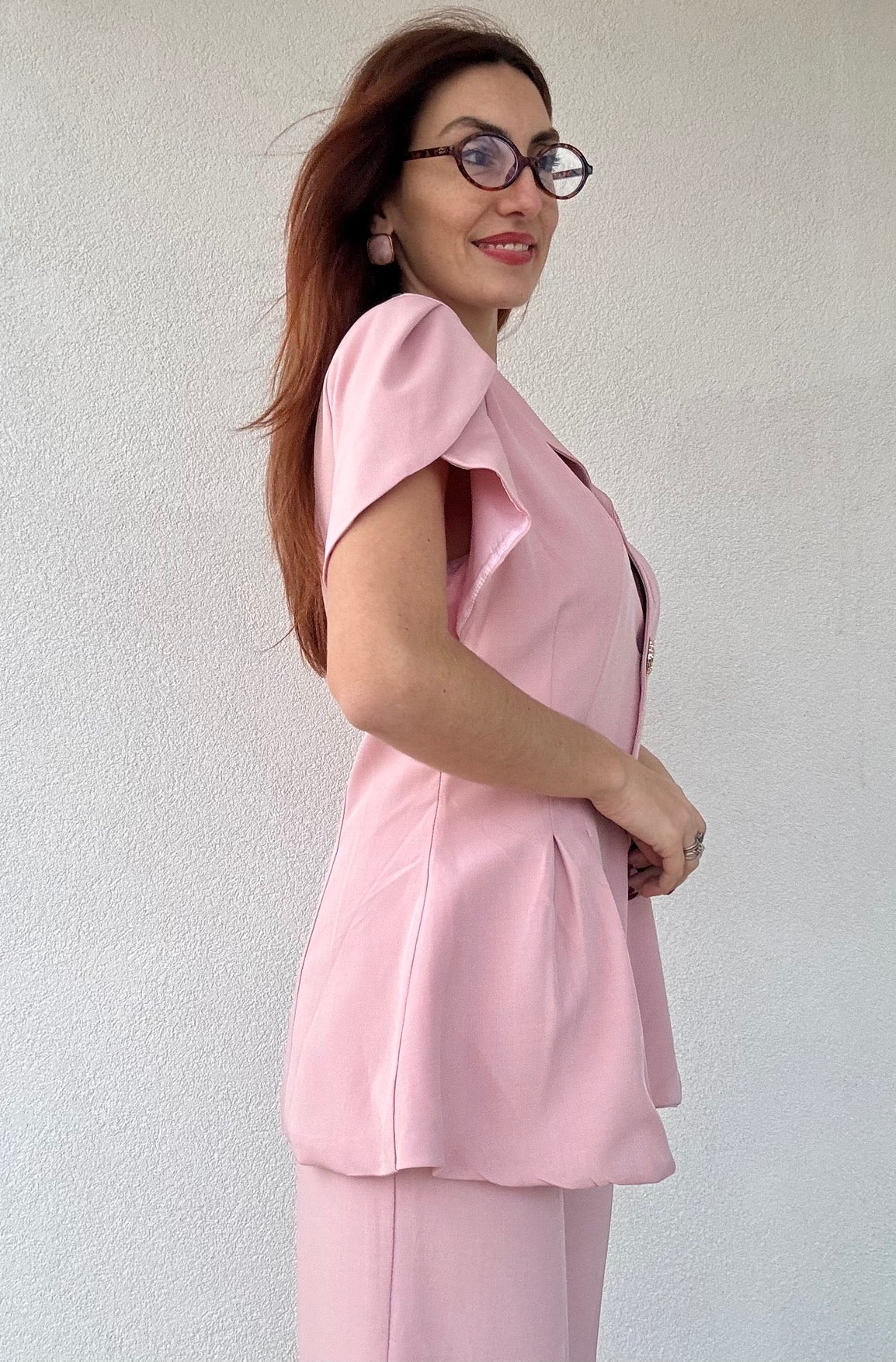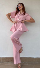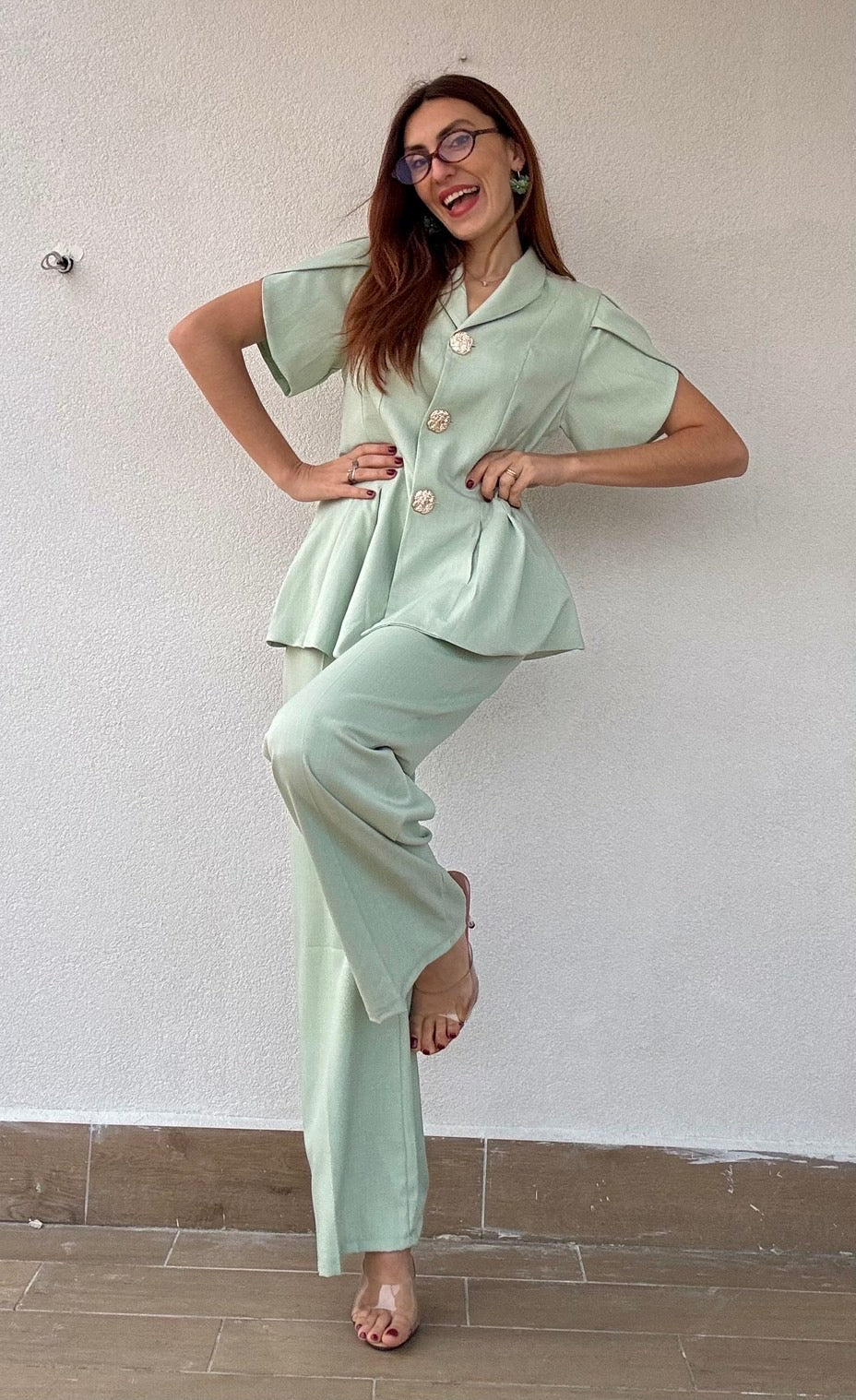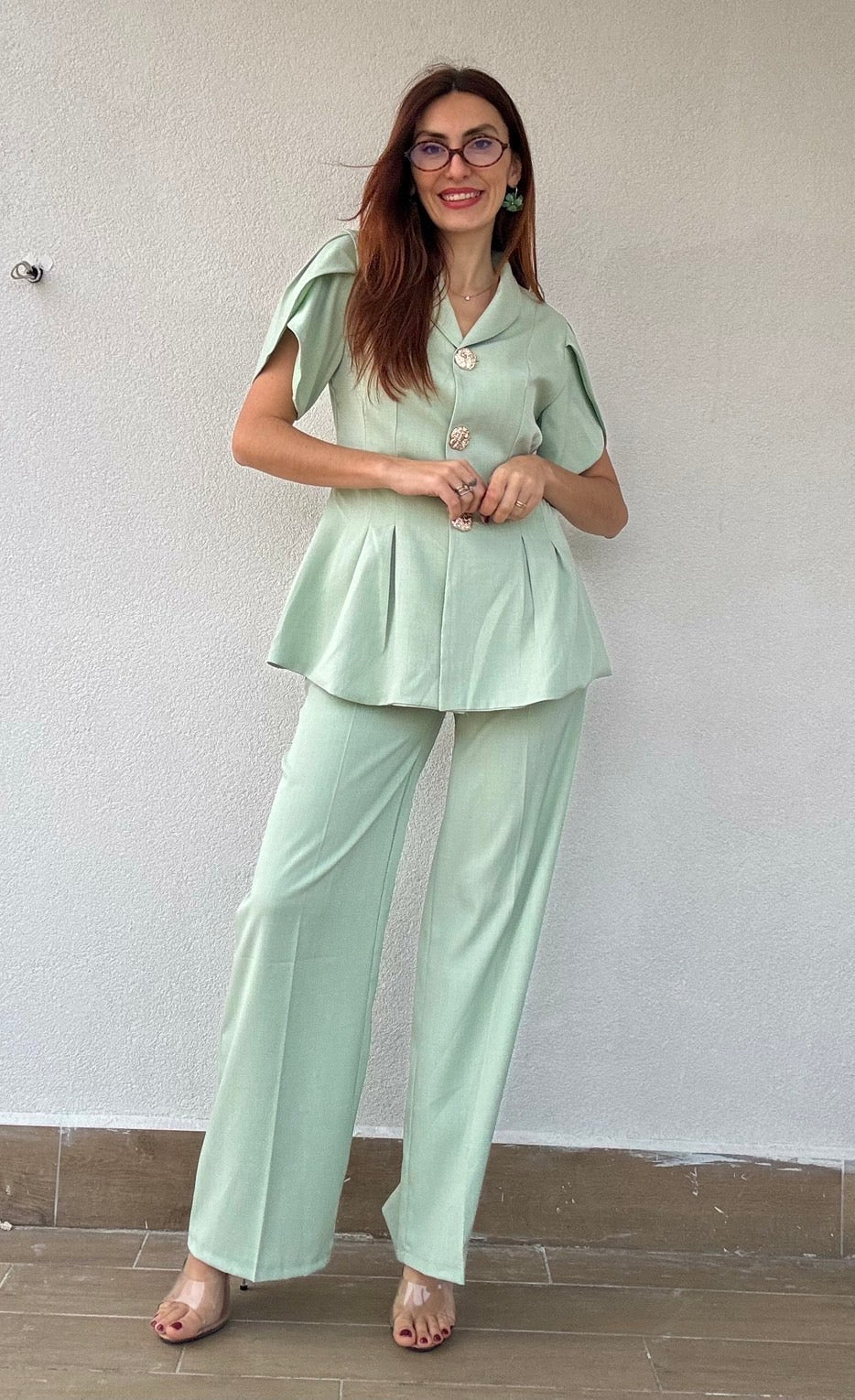 Elegante tailleur composto da pantalone con bottone frontale ed elastico posteriore, abbinato a giacca con maniche a petalo e pregiati bottoni dorati. La Taglia Unica si adatta perfettamente anche a chi indossa una L, garantendo una vestibilità confortevole e raffinata. Disponibile in 2 varianti di colore per adattarsi al tuo stile personale.
