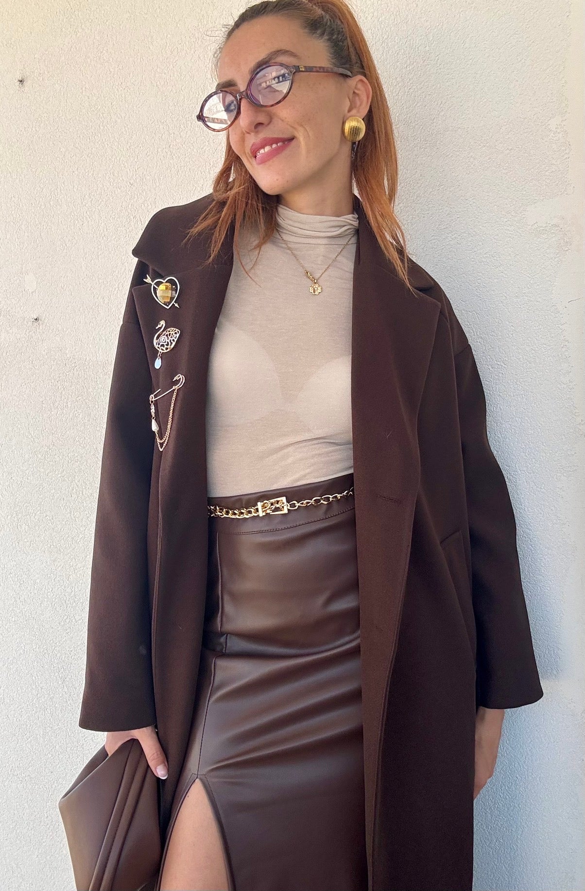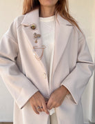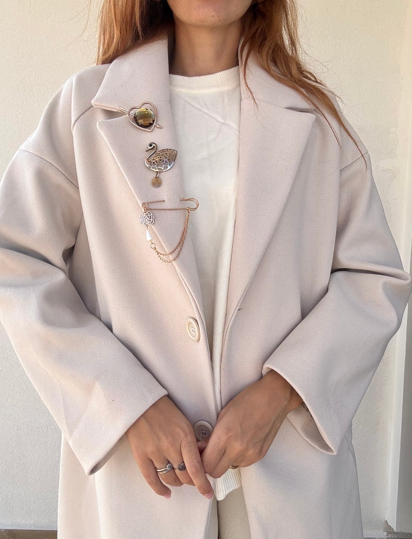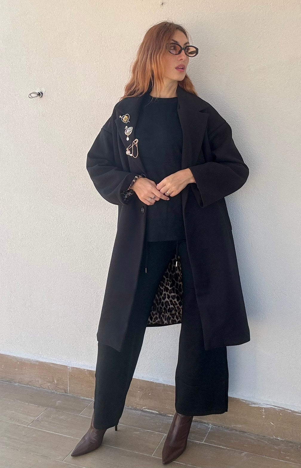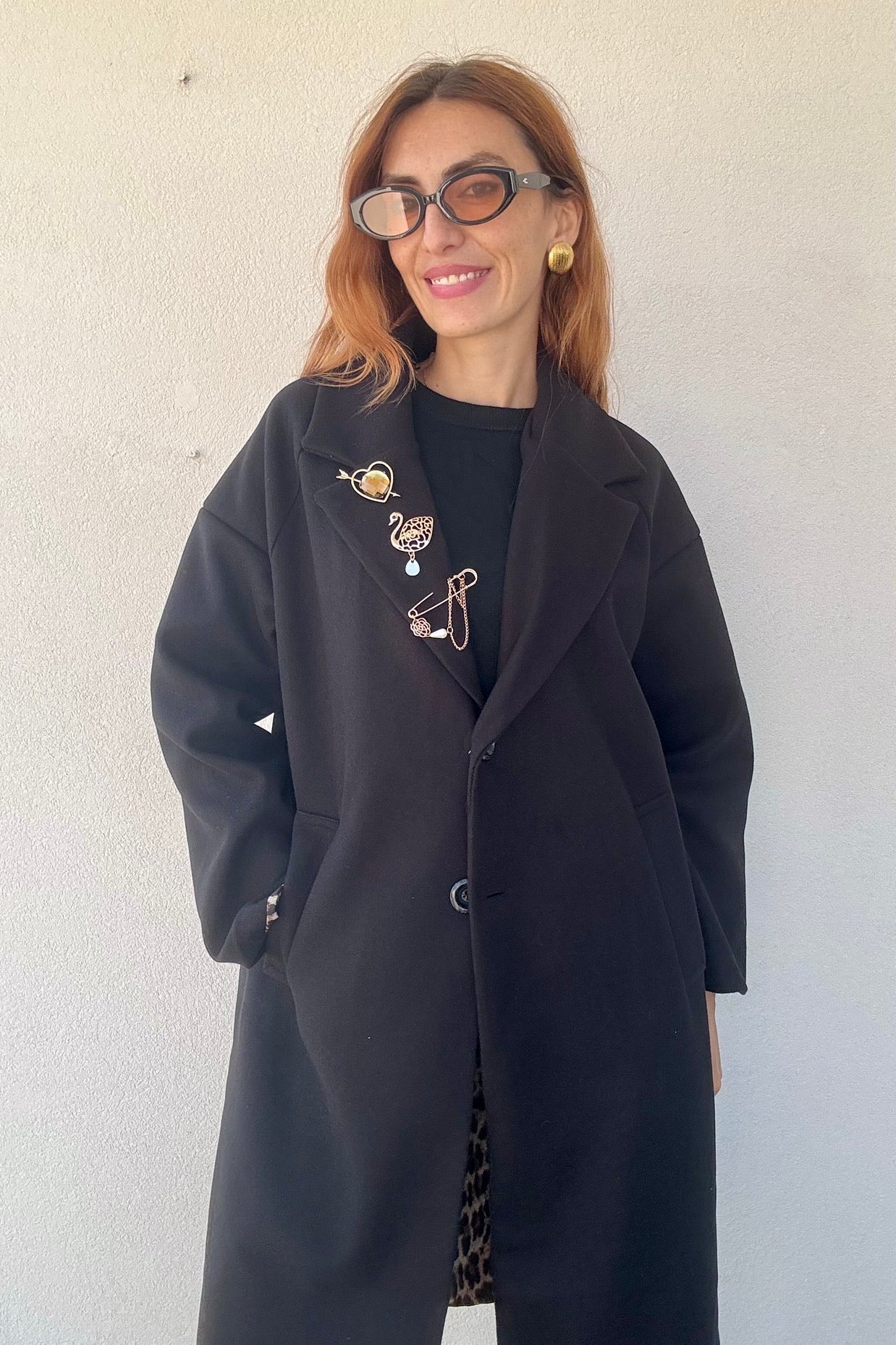Questo cappotto oversize con spille applicate sul davanti unisce stile e comodità in un unico capo. La taglia unica è studiata per vestire perfettamente anche chi porta una L, garantendo una vestibilità versatile e confortevole. Aggiungi un tocco di originalità al tuo guardaroba con questo capo distintivo e pratico.