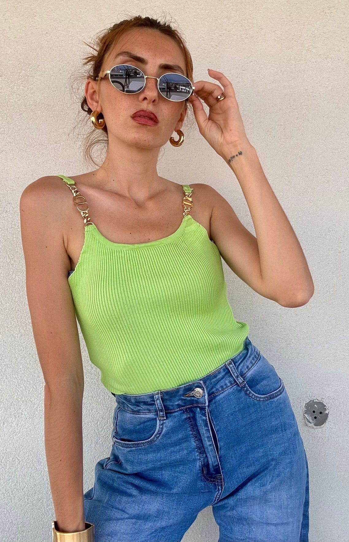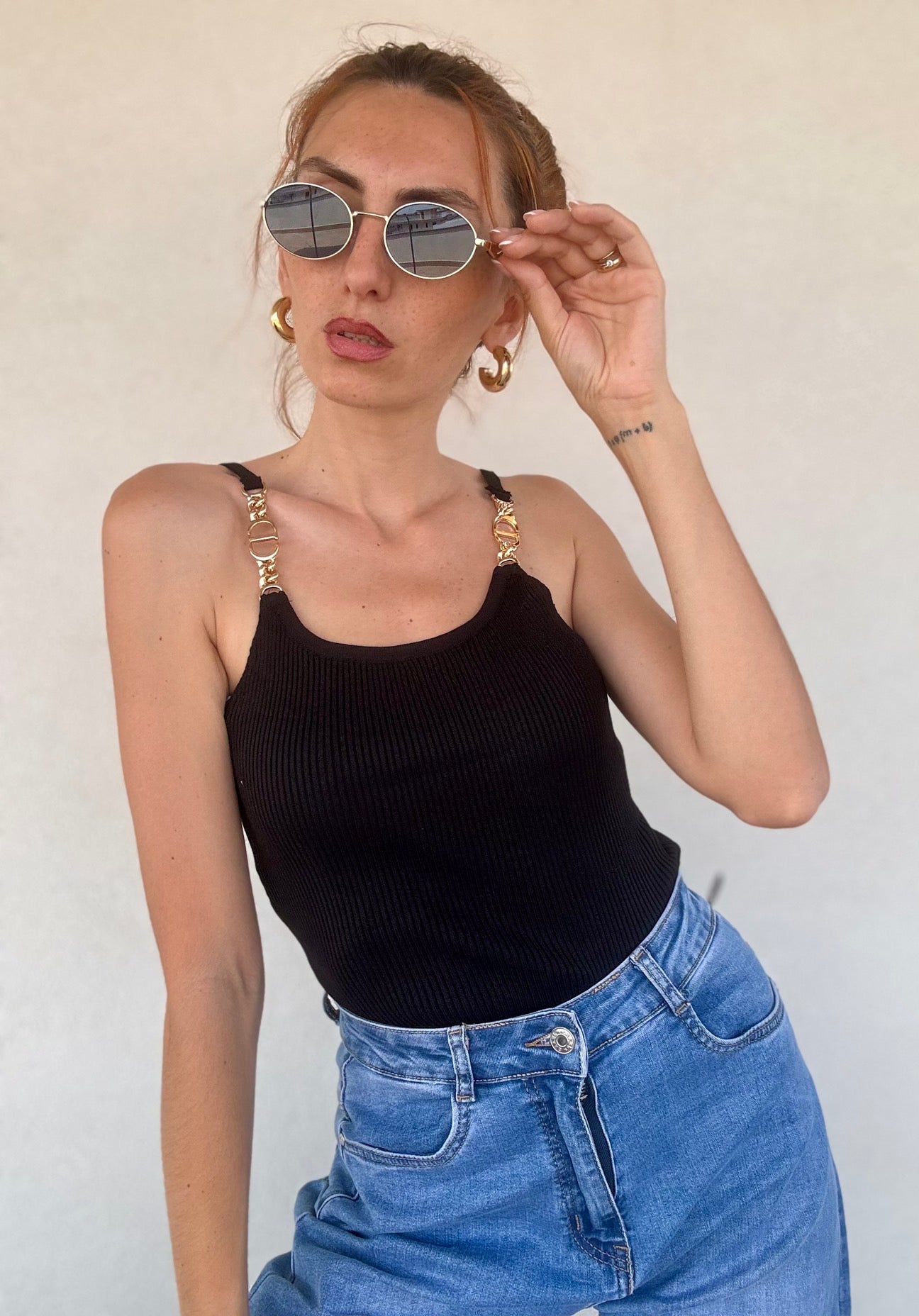 Il top Golden in filo con spallina sottile oro unisce eleganza e comfort, valorizzando ogni silhouette fino alla taglia L. Disponibile in sei colori raffinati, è la scelta perfetta per un look sofisticato e versatile, ideale per ogni occasione.