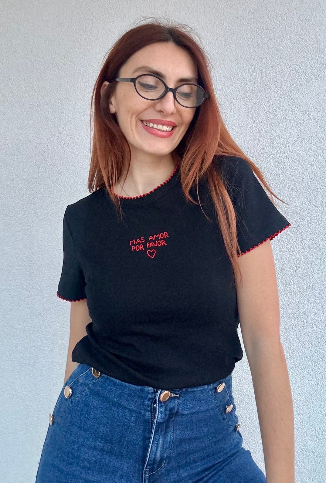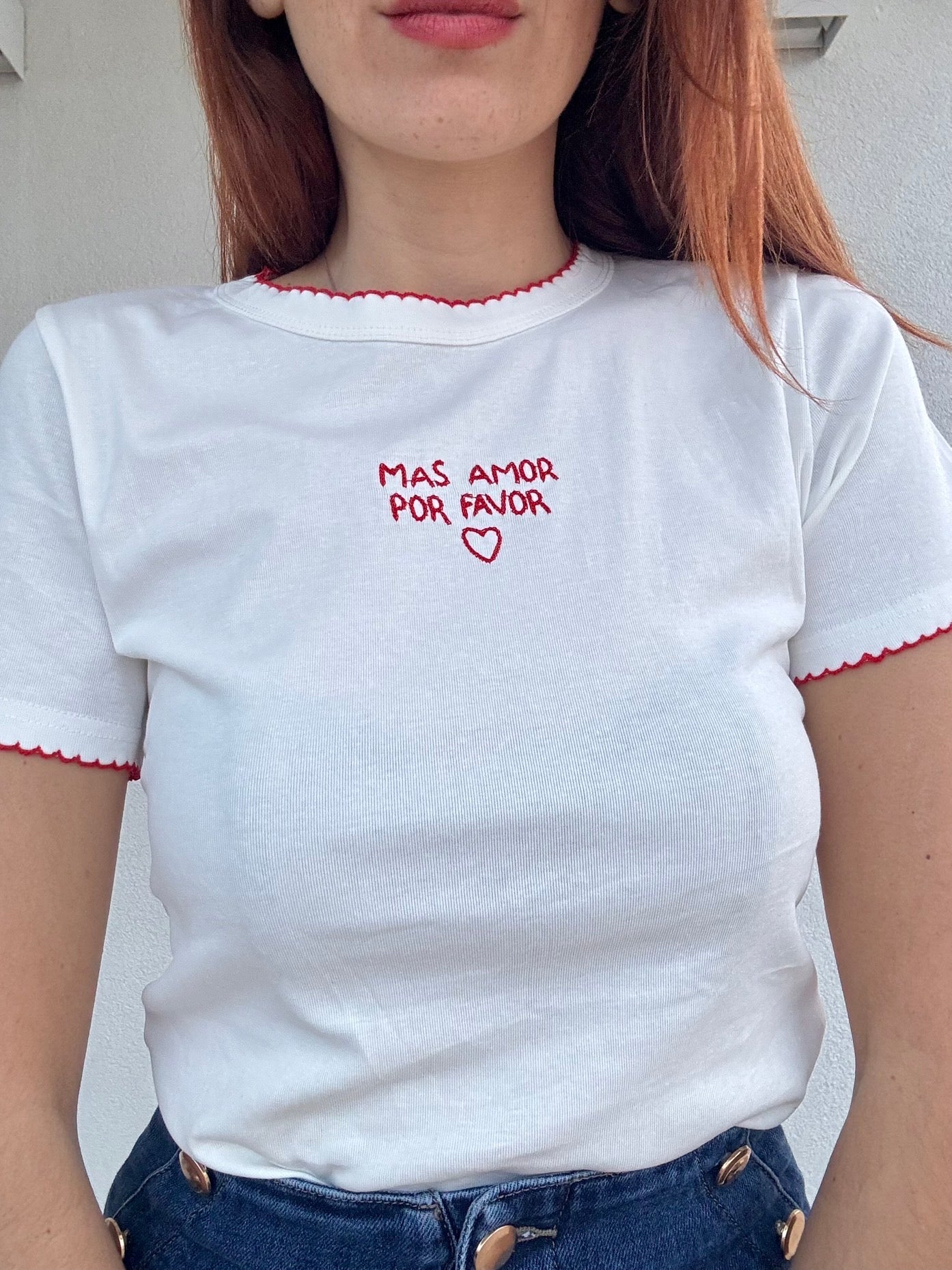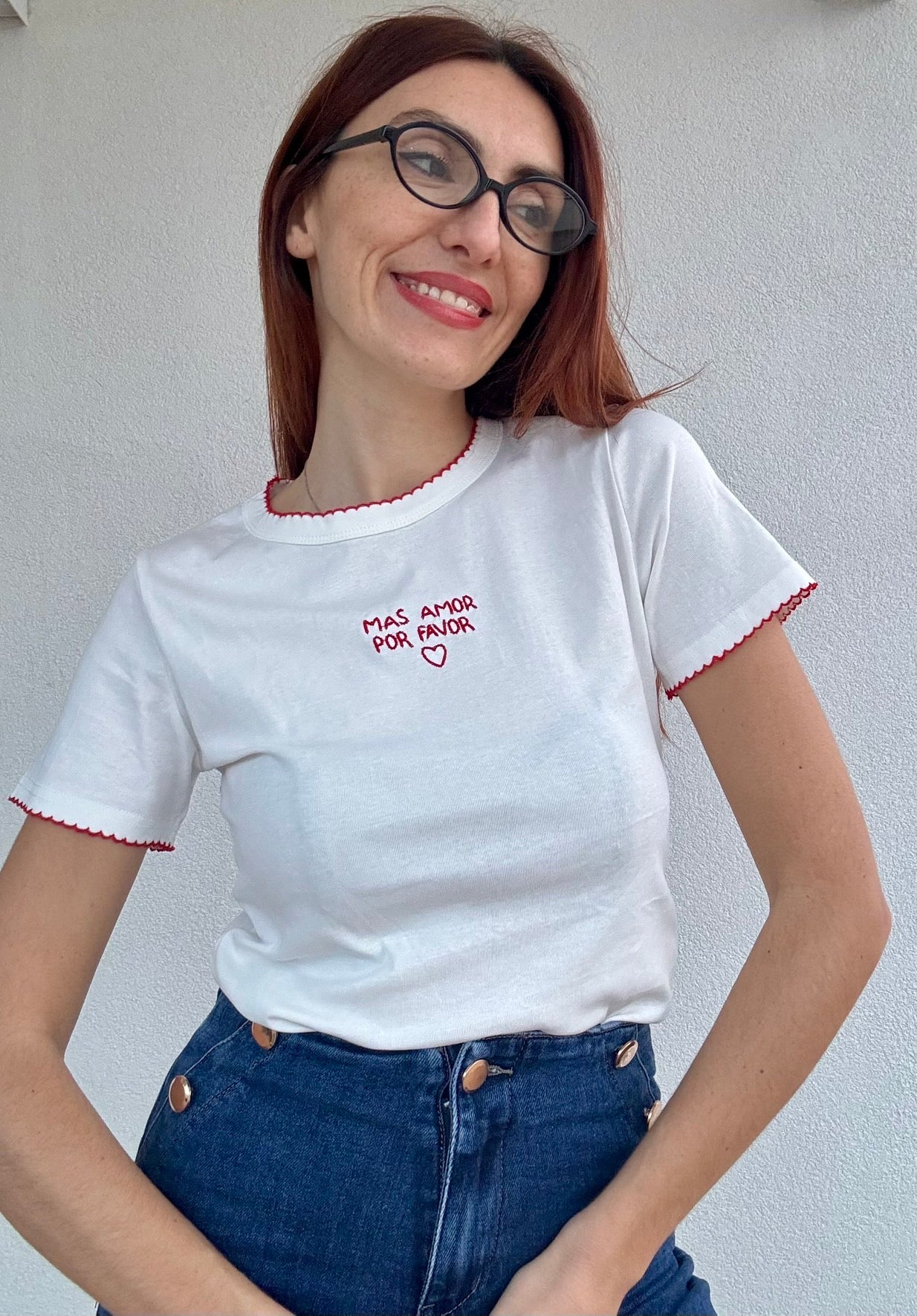 Elegante shirt a mezza manica con ricamo "Mas Amor" al centro del petto, impreziosita da dettagli ricamati su collo e maniche. Realizzata con cura artigianale, questa maglietta combina stile e comfort per un look sofisticato. Disponibile in 2 tonalità e nelle taglie S/M e L/XL, perfetta per chi ricerca un capo versatile e caratteristico da indossare in ogni occasione.
