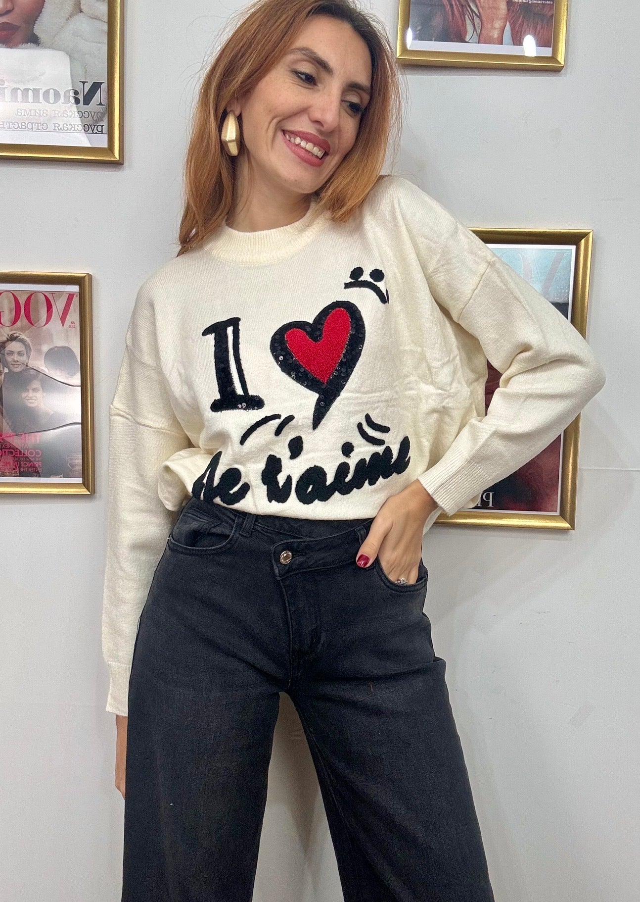 Scopri il nostro Pull "Je T'Aime", il capo perfetto per chi ama esprimere sentimenti con stile. Realizzato in 50% viscosa, offre morbidezza e comfort superiori. La scritta "Je T'Aime" ricamata con dettagli di paillettes applicate crea un effetto luminoso e affascinante che cattura lo sguardo. Taglia Unica versatile, veste perfettamente fino a una L, adattandosi a diverse silhouette. Disponibile in 3 colori per trovare la tonalità che rispecchia la tua personalità. Un pullover che trasforma ogni momento in un'occasione per brillare con eleganza e romanticismo.