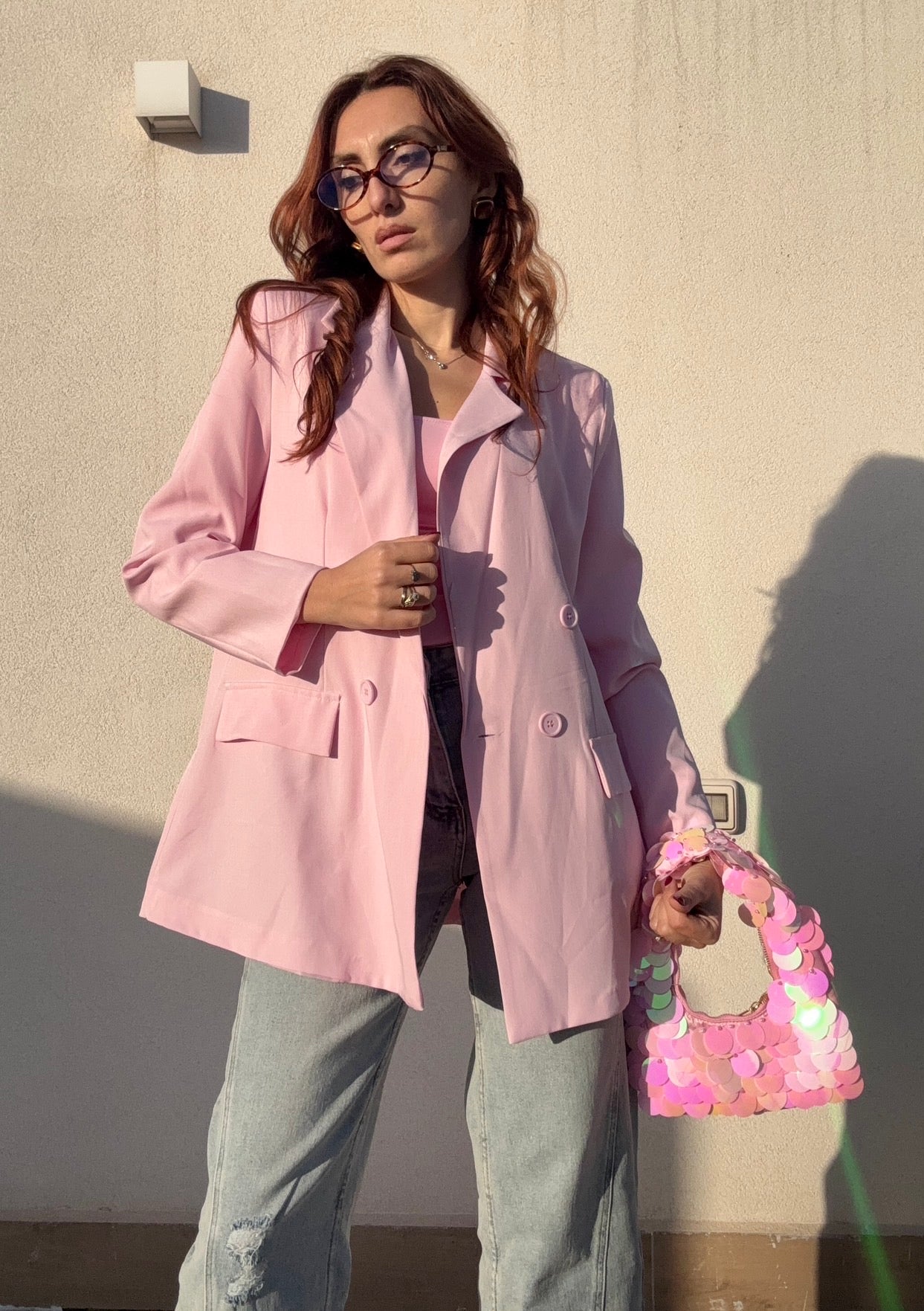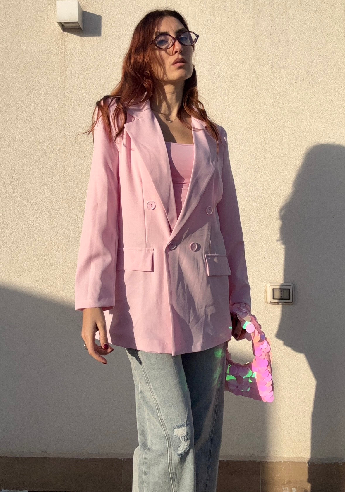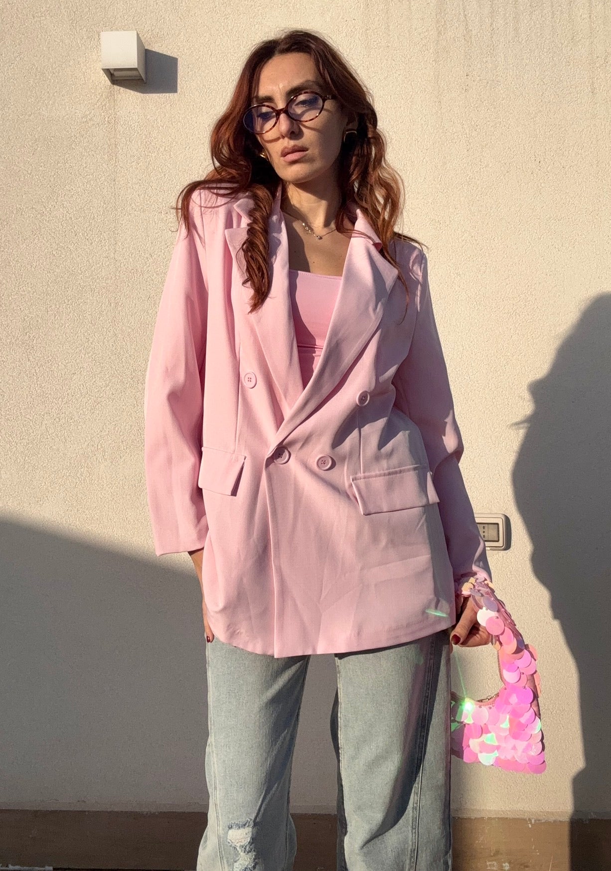Blazer over in rosa che conquista con la sua silhouette generosa e sofisticata. Perfetto per chi ama uno stile rilassato ma elegante, veste comodamente anche in taglia L grazie alla vestibilità ampia. Un capo versatile che si adatta a molteplici occasioni, dal casual chic all'ufficio, trasformando qualsiasi outfit con un tocco di classe e personalità.