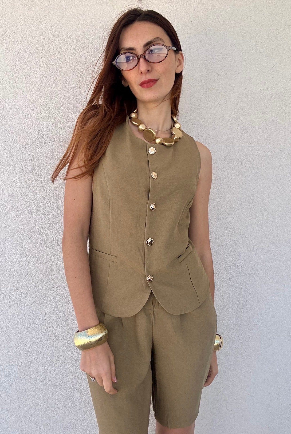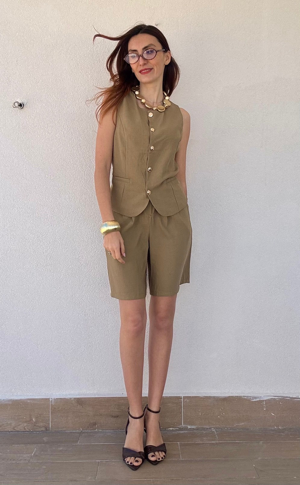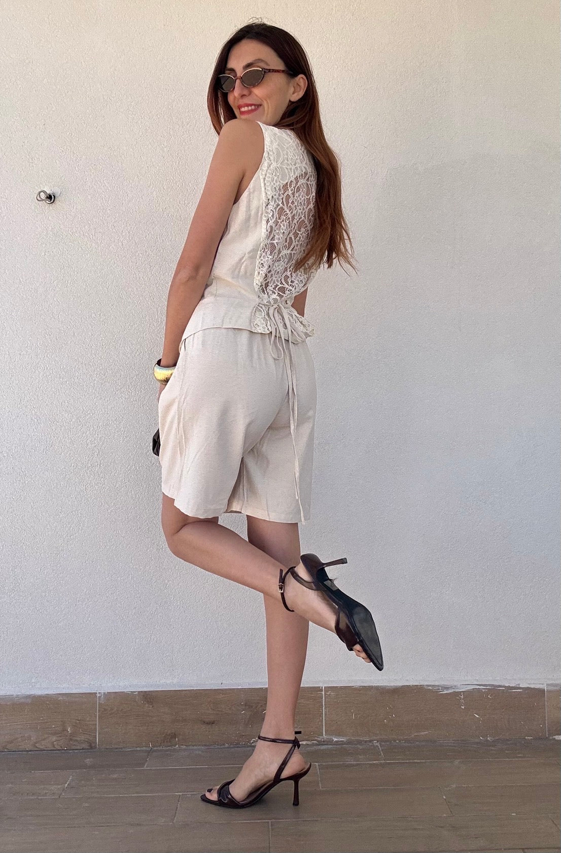 Completo misto Lino elegante e versatile che combina stile e comfort. Il gilet presenta un delicato pizzo sul retro e laccetti regolabili per una vestibilità personalizzata. I Bermuda completano il look con bottone e elastico in vita per una calzata perfetta. Disponibile nelle taglie S, M e L in 3 varianti di colore per adattarsi al tuo stile personale. Un'opzione ideale per occasioni casual o semi-formali.