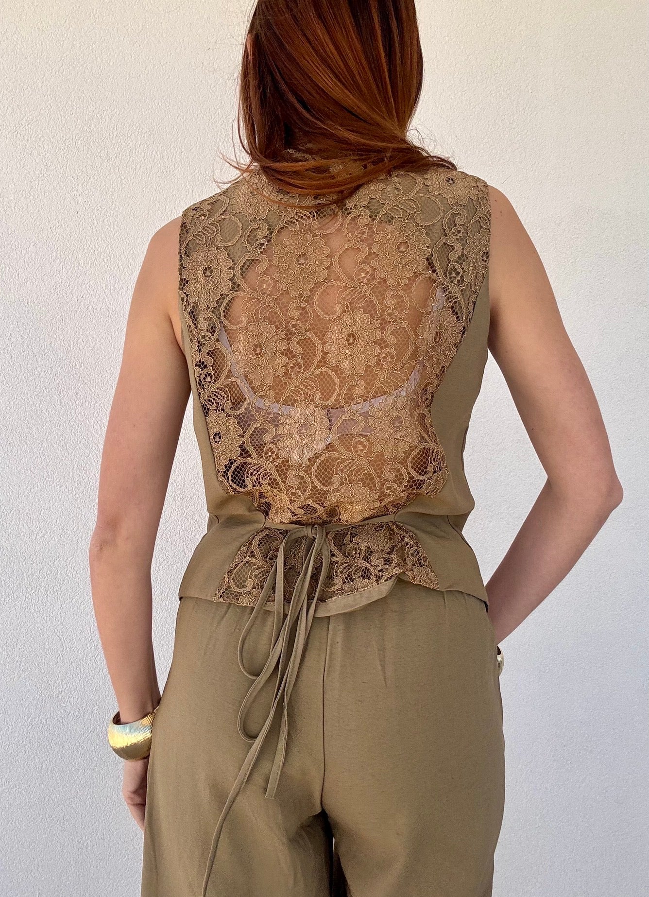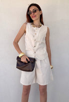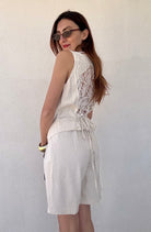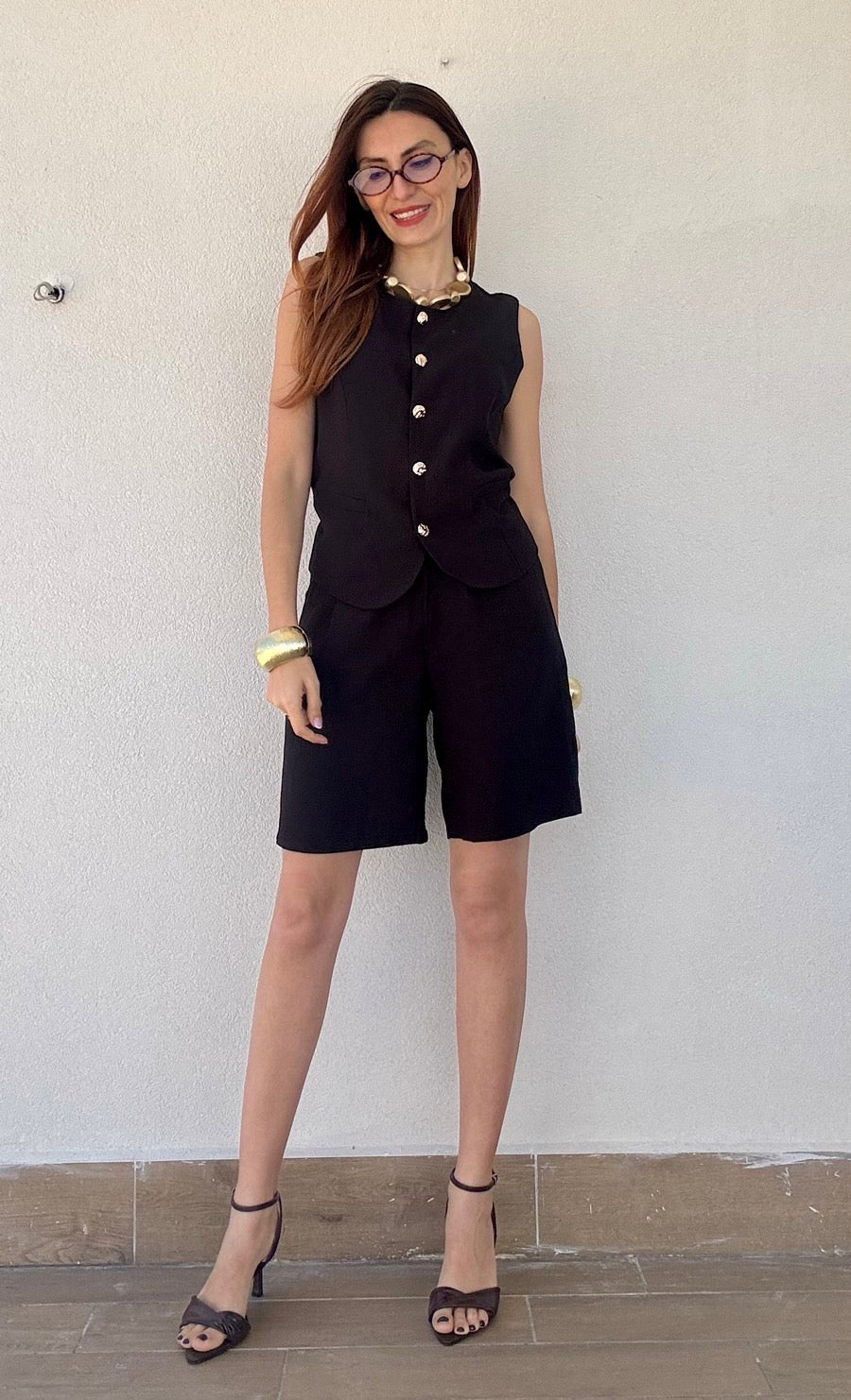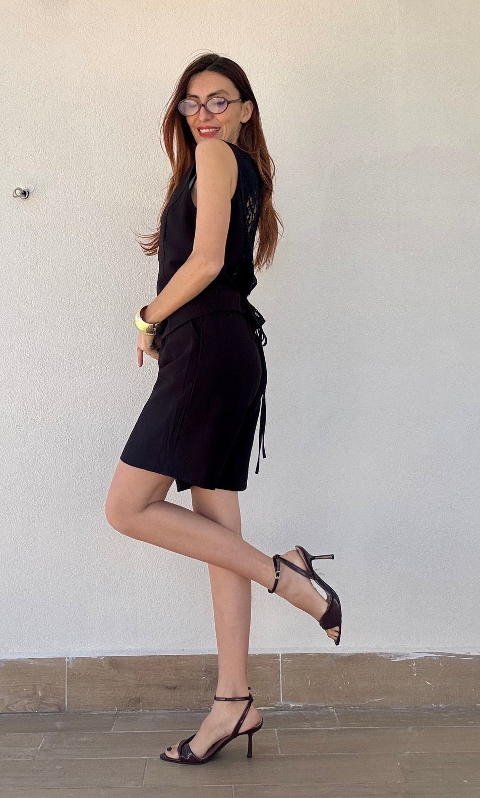 Completo misto Lino elegante e versatile che combina stile e comfort. Il gilet presenta un delicato pizzo sul retro e laccetti regolabili per una vestibilità personalizzata. I Bermuda completano il look con bottone e elastico in vita per una calzata perfetta. Disponibile nelle taglie S, M e L in 3 varianti di colore per adattarsi al tuo stile personale. Un'opzione ideale per occasioni casual o semi-formali.