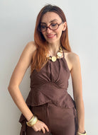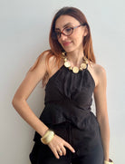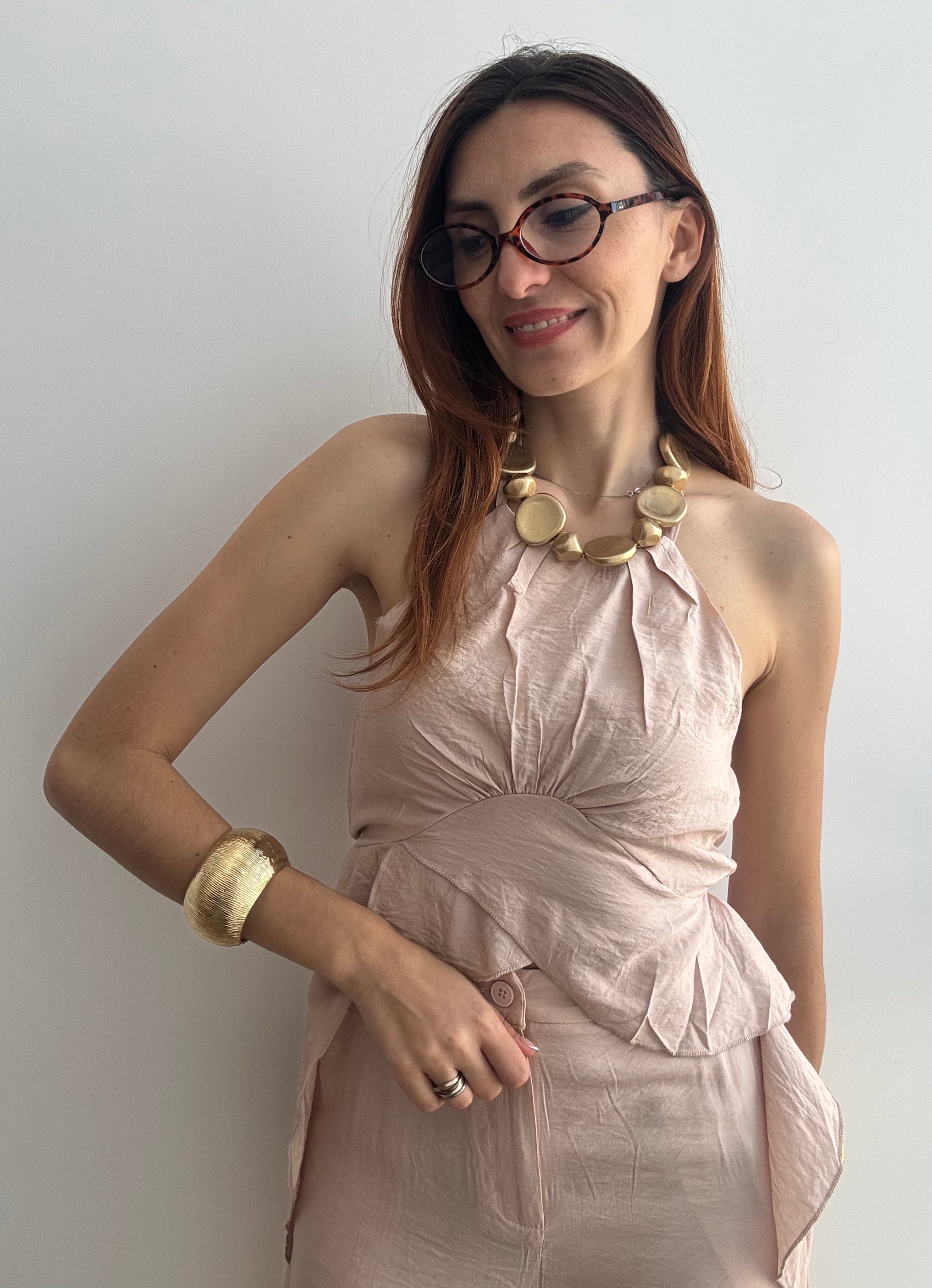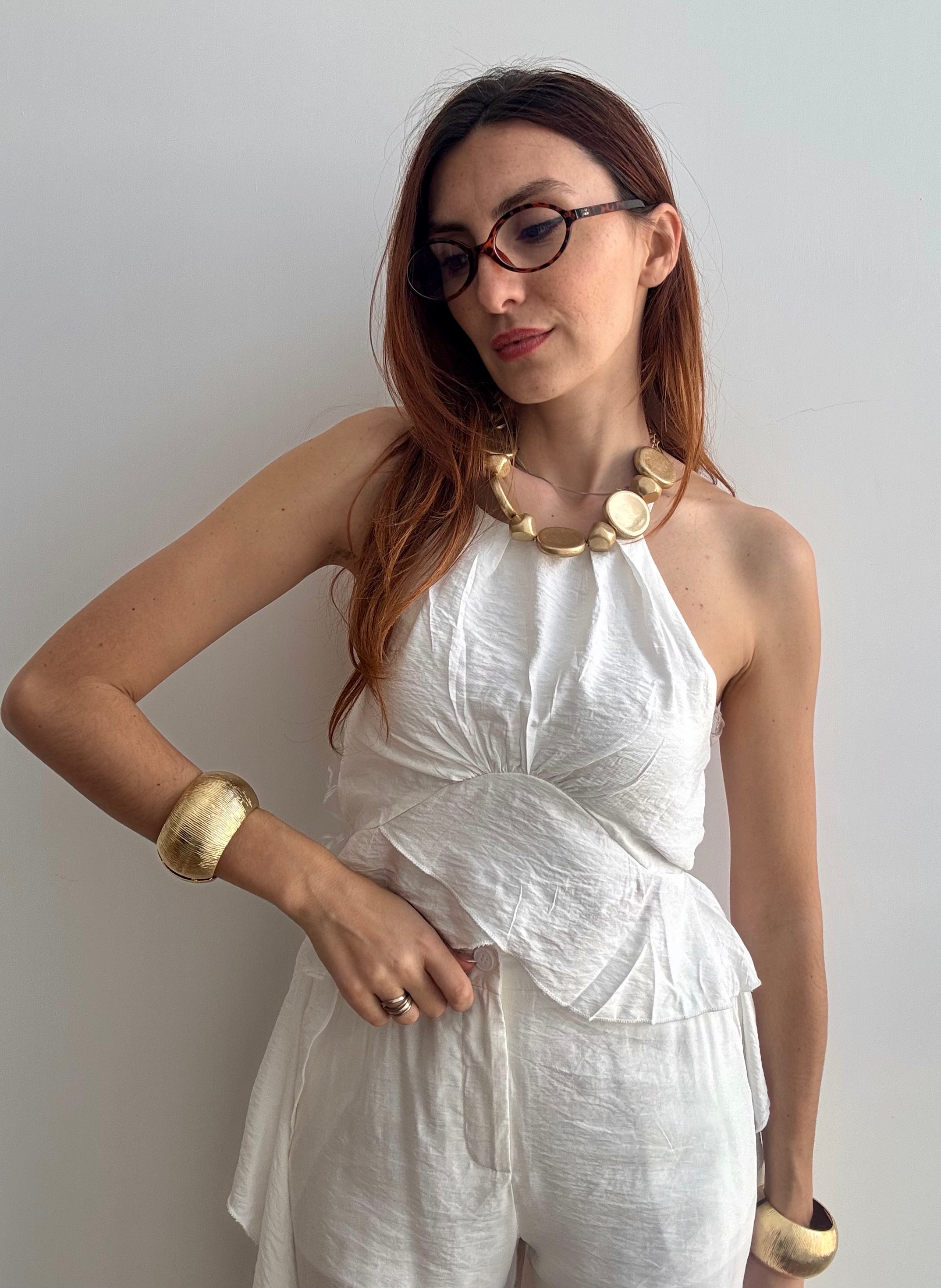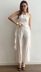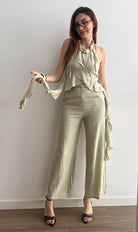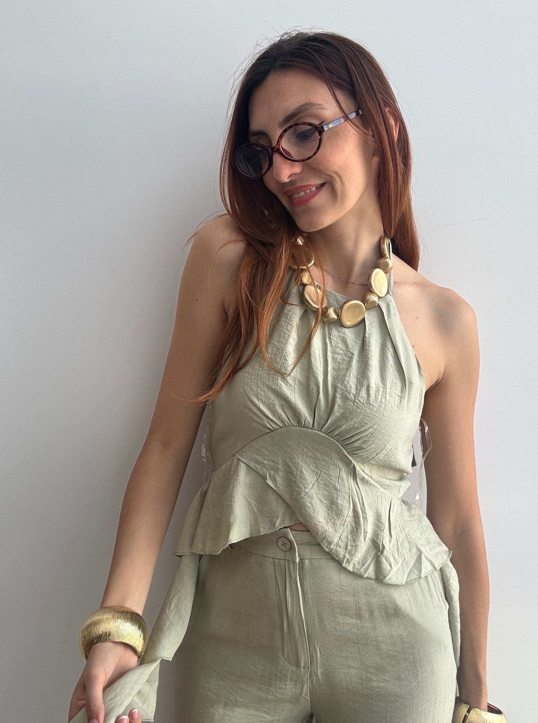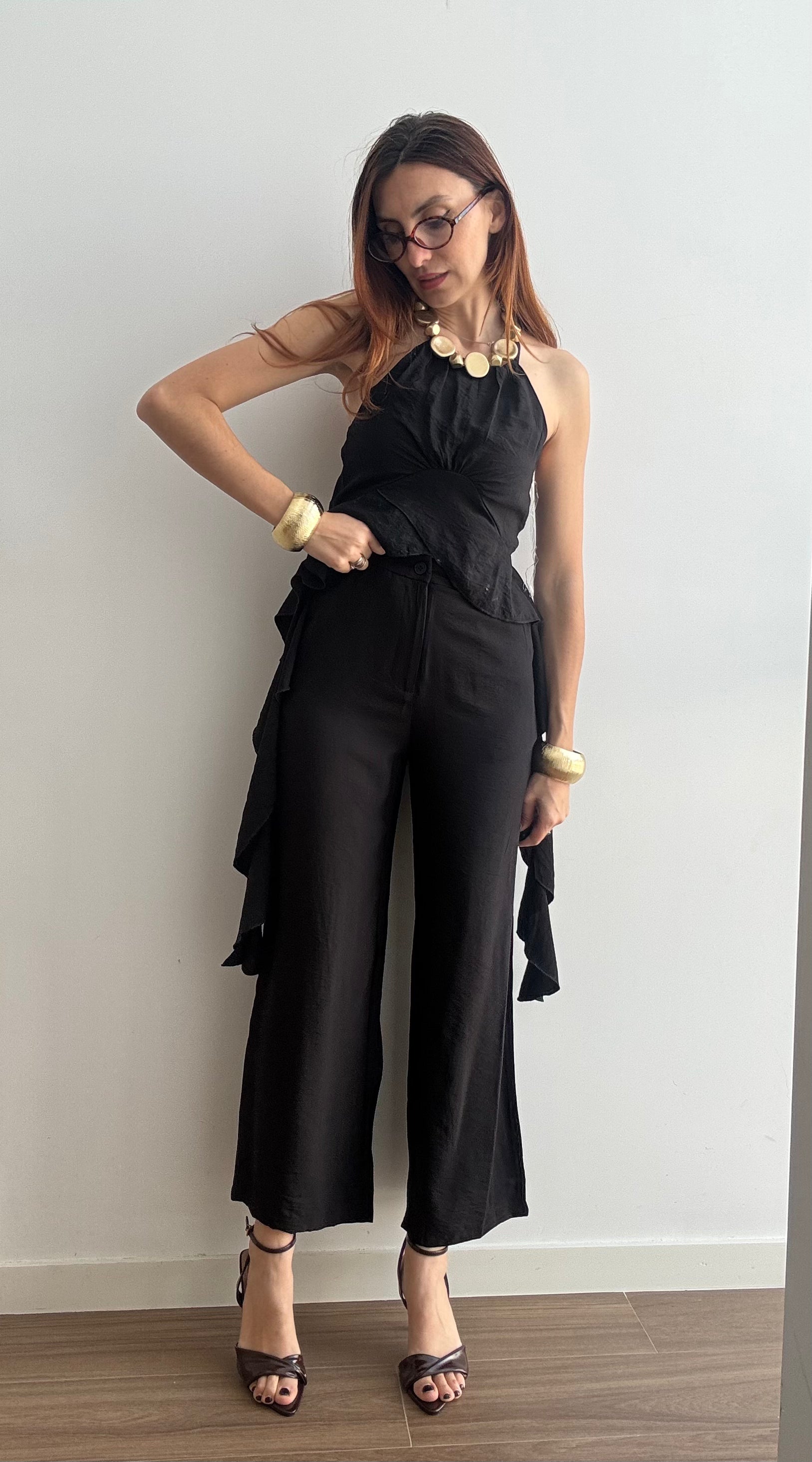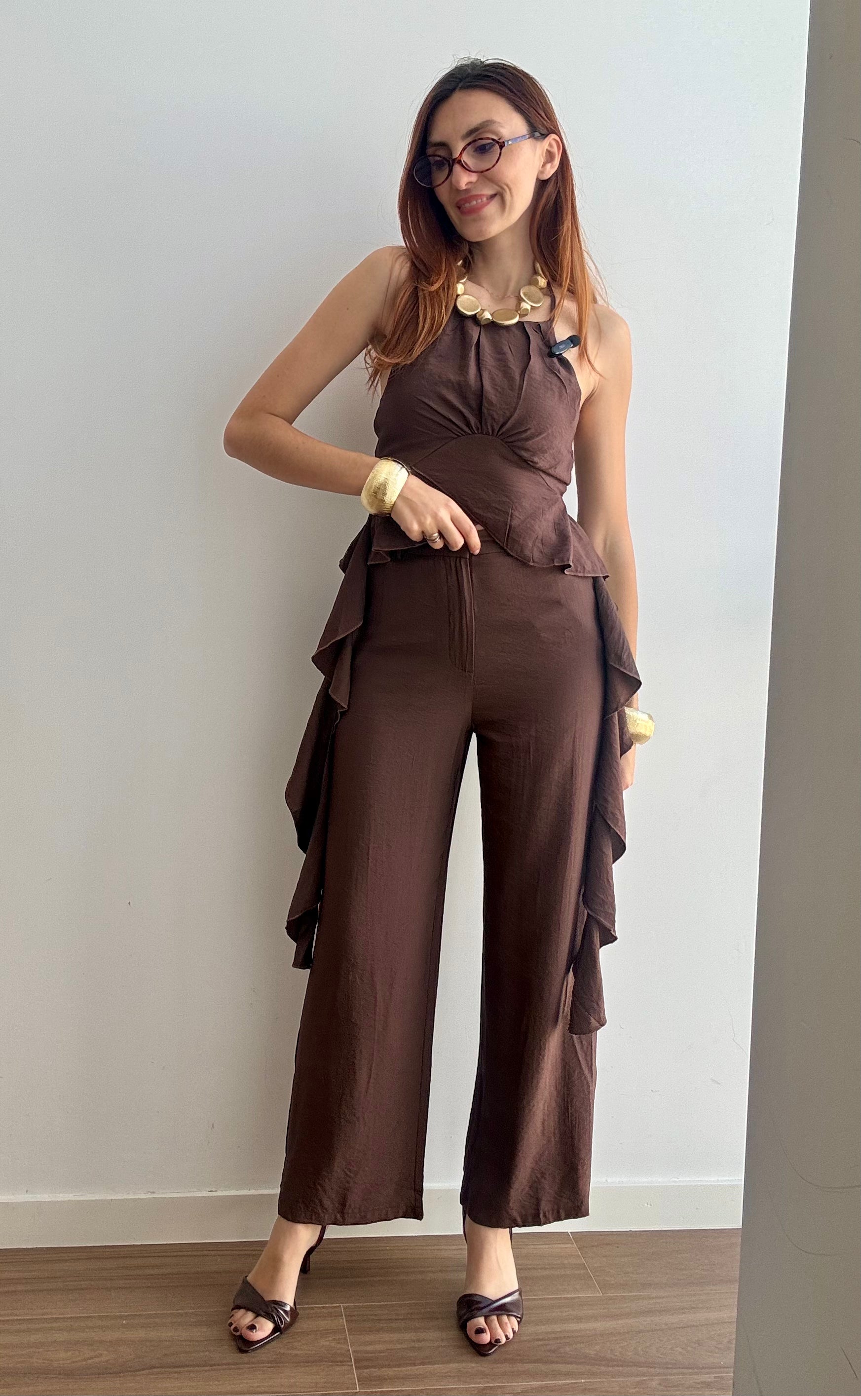 Il Completo Victoria è un'elegante due pezzi in viscosa che unisce comfort e stile. Il pantalone presenta un bottone frontale e un pratico elastico sul retro per una vestibilità rilassata, mentre il top affascina con un allaccio al collo e delicati volant laterali che creano movimento e femminilità. Realizzato in viscosa morbida e fluida, questo completo offre una silhouette regolare che valorizza senza stringere. Perfetto per occasioni casual o semi-formali, si adatta facilmente a diversi stili personali. Disponibile nelle taglie S/M e L/XL, scegli tra 4 colori per trovare la tonalità che meglio rispecchia il tuo gusto.