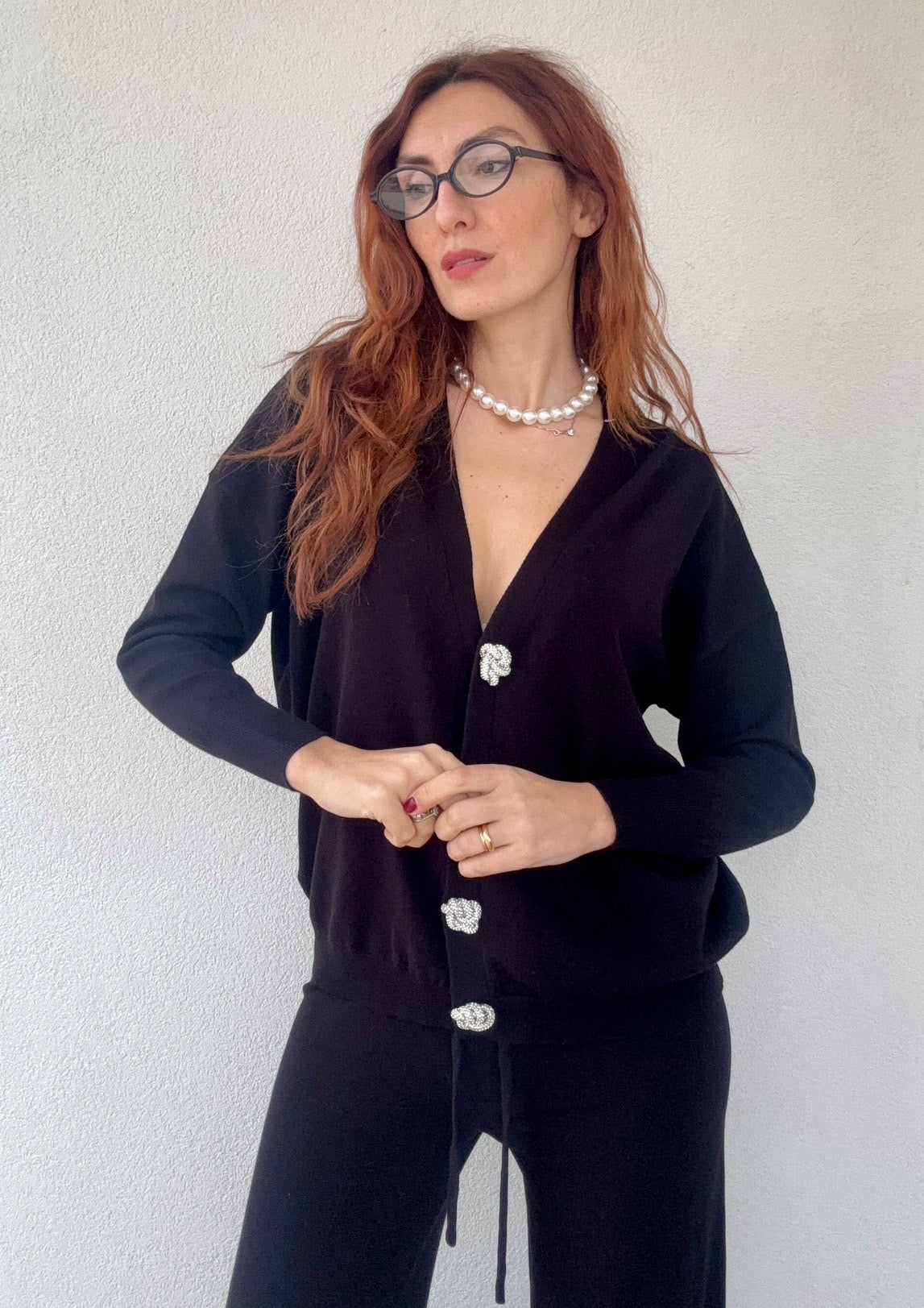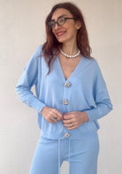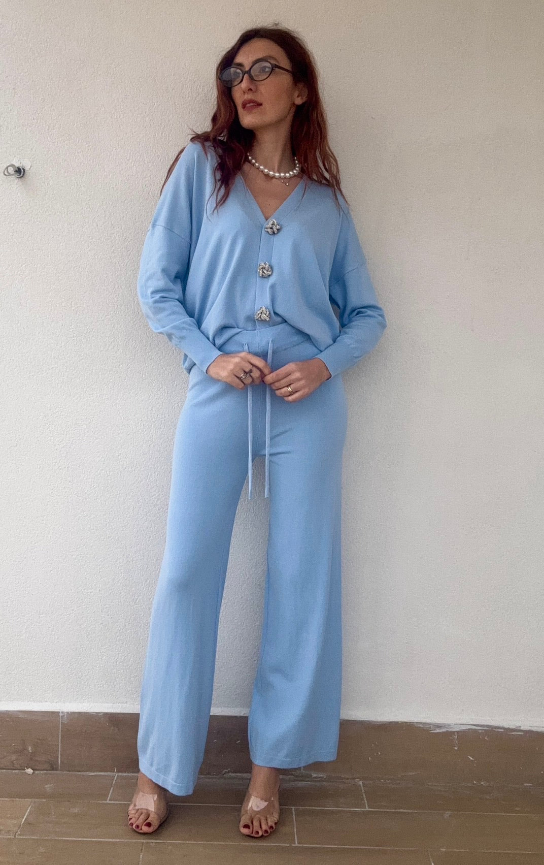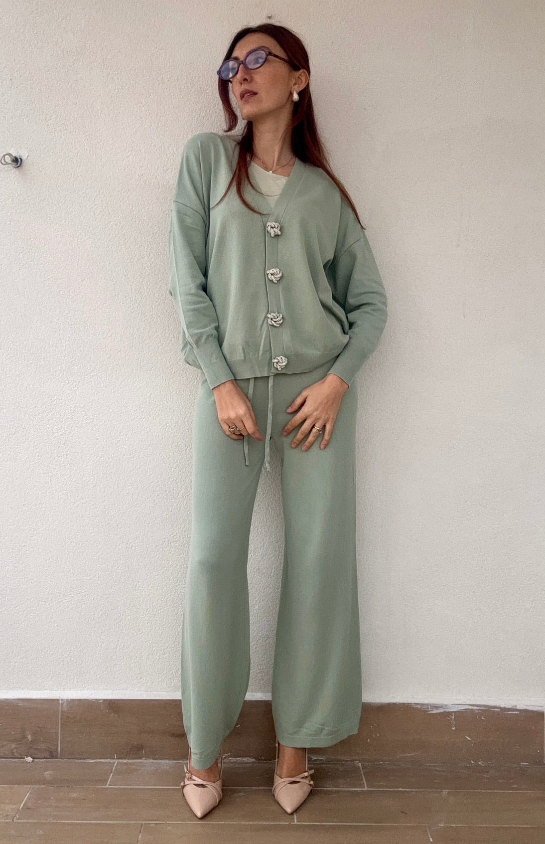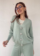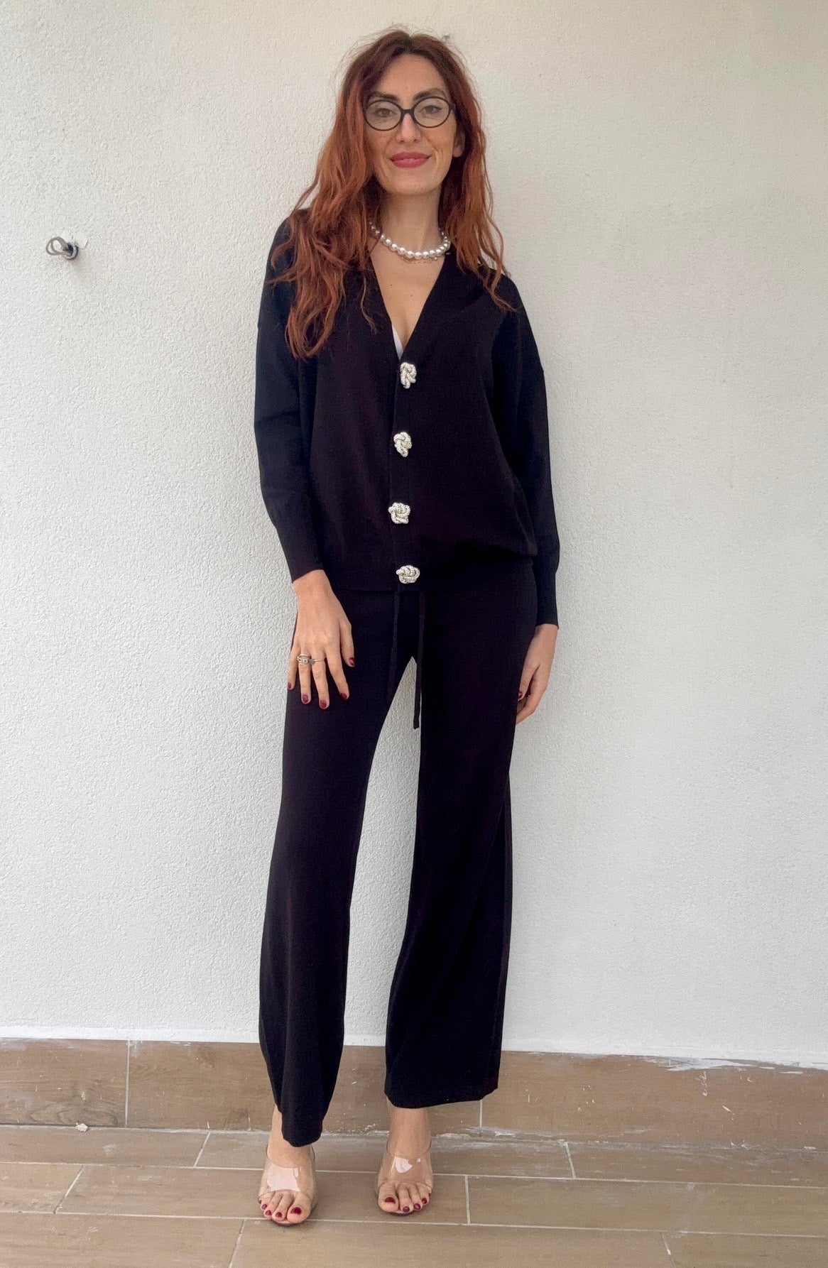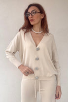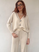 Coordinato elegante composto da pantalone a vita alta e cardigan abbinato, perfetto per chi ricerca stile e comfort. Il cardigan è impreziosito da bottoni gioiello che aggiungono un tocco di sofisticazione a ogni look. La taglia unica si adatta generosamente, vestendo bene anche una 48, garantendo una vestibilità ideale per diverse morfologie. Disponibile in 4 colori per esprimere il tuo stile personale.