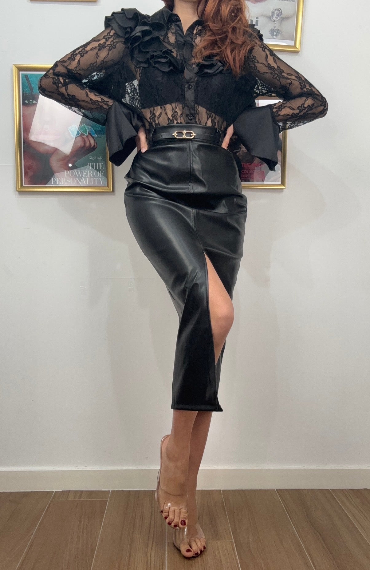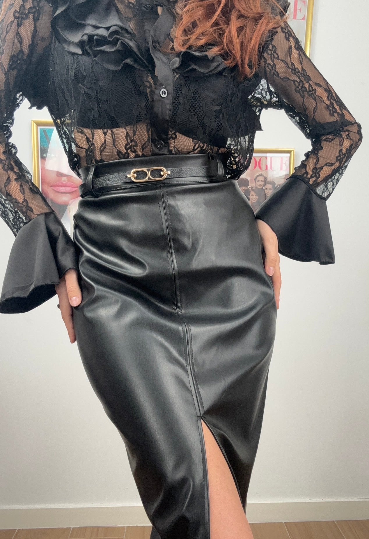 Longuette elegante in similpelle che cattura lo stile parigino con un tocco sofisticato. La cinturina integrata definisce la silhouette, creando una linea affusolata che valorizza la figura. Perfetta per occasioni speciali o per elevare il tuo look quotidiano, questa gonna midi combina versatilità e fascino senza tempo. Disponibile nelle taglie S e M per un fit impeccabile.