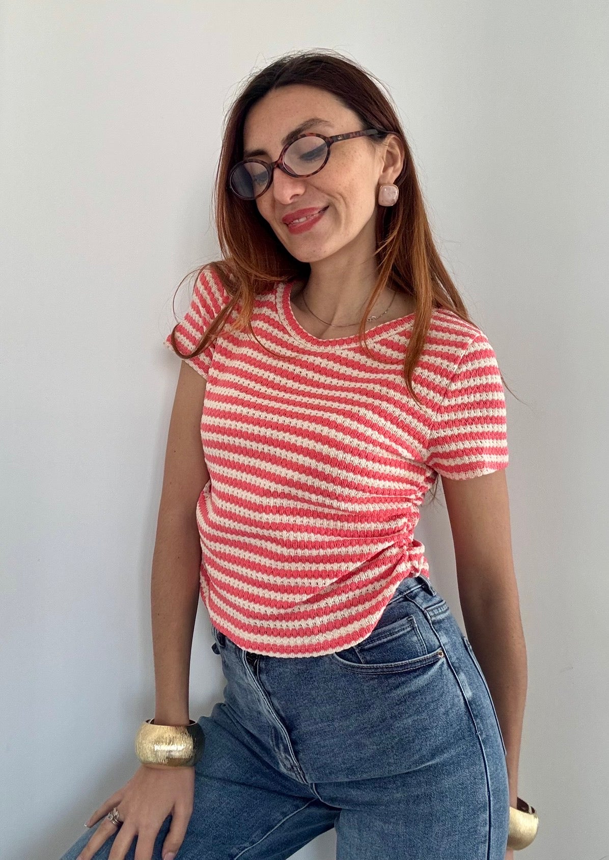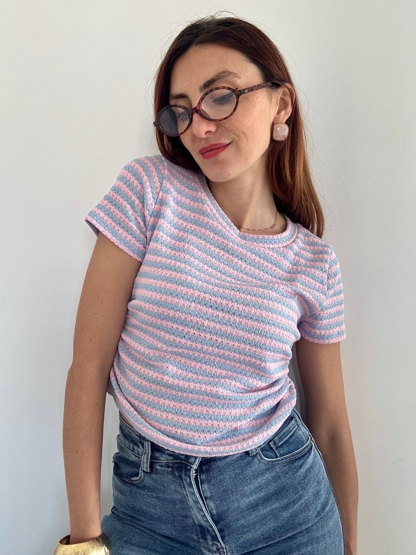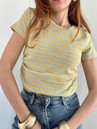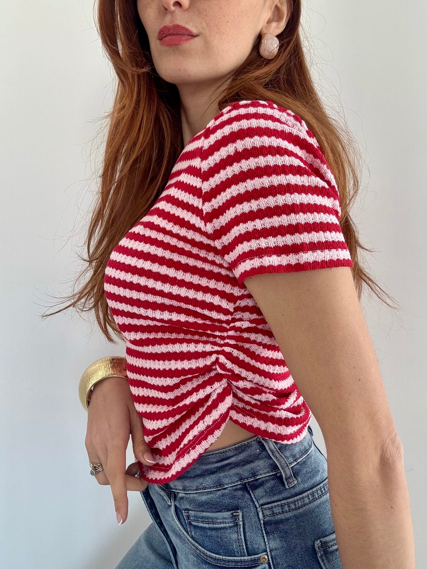 Maglia elegante in filo traforato che cattura la luce con delicatezza. Il dettaglio dell'arriccio ai lati affina la silhouette e regala movimento al capo. Taglia Unica elasticizzata, perfetta fino alla L, si adatta comodamente a diverse morfologie. Disponibile in 4 colori per abbinare il tuo stile personale. Un pezzo versatile ideale per la stagione calda, da indossare da solo o in layering.