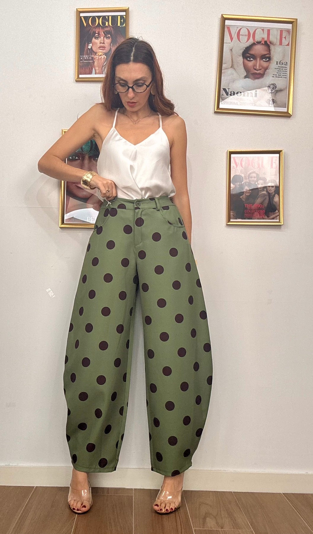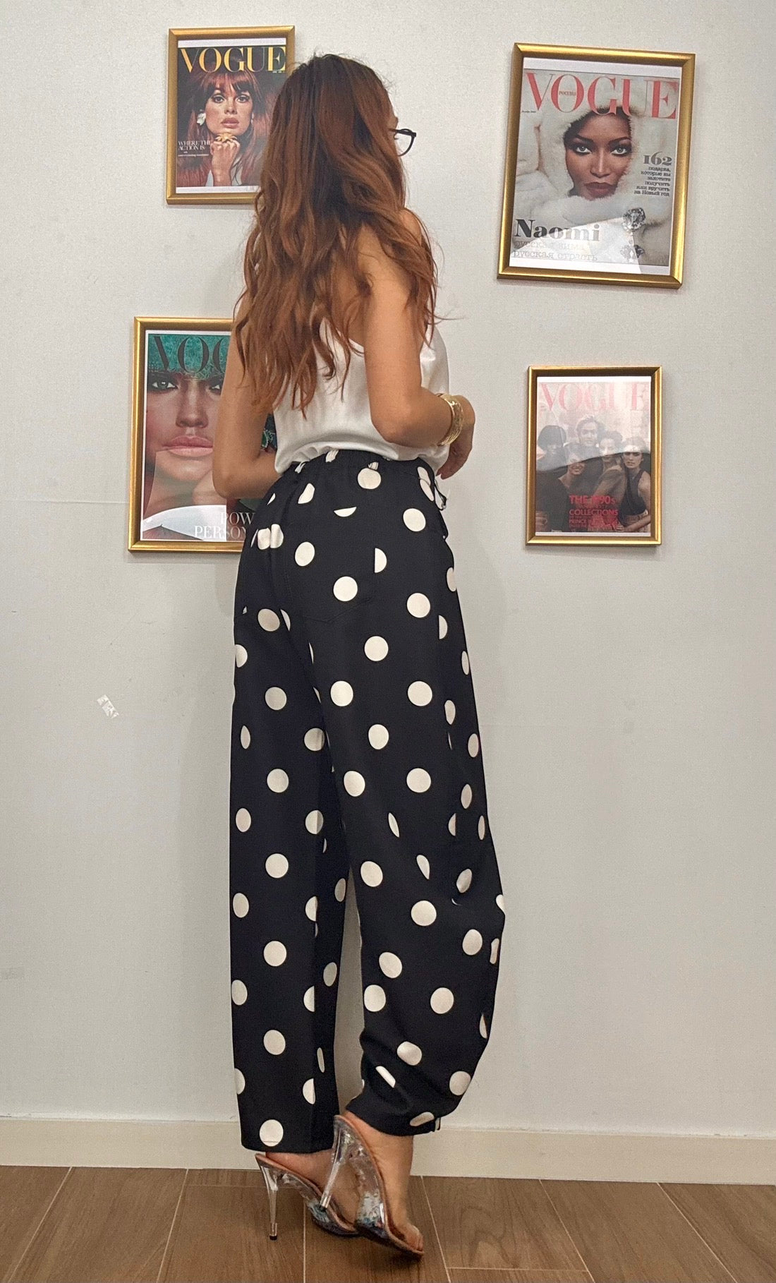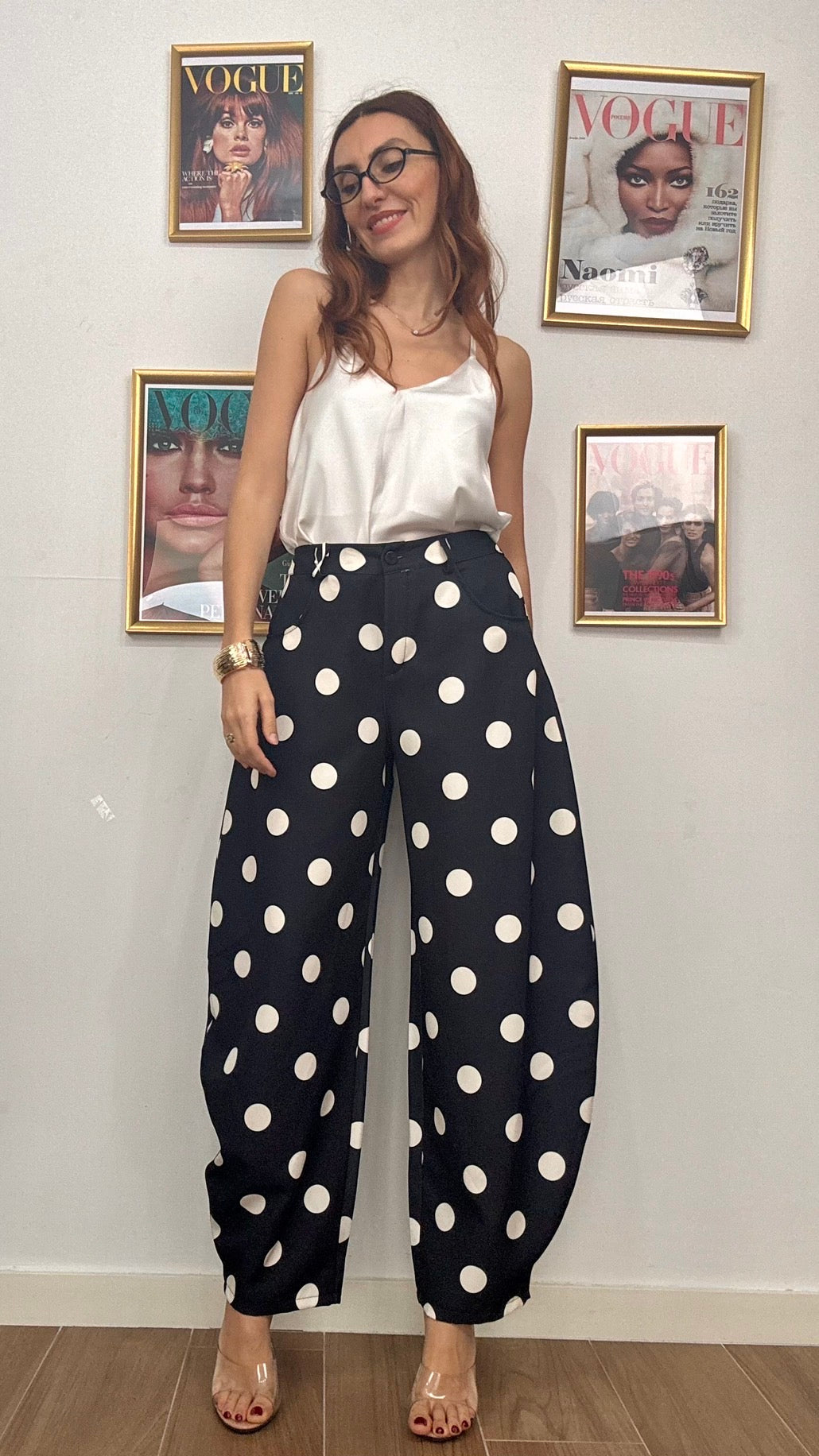 Pantalone modello balloon a vita alta con affascinante fantasia a pois. Tagliato in taglia unica che si adatta perfettamente anche a una L, garantendo una vestibilità comoda e lusinghiera. Disponibile in tre varianti di colore per adattarsi al tuo stile personale. Un capo versatile e raffinato per chi ama i dettagli classici con un tocco di carattere.