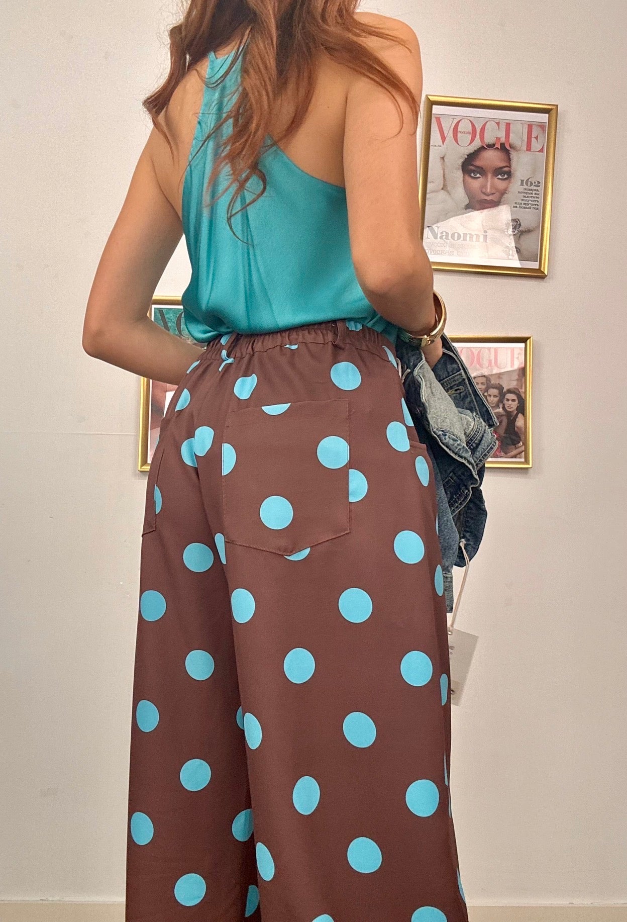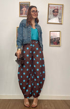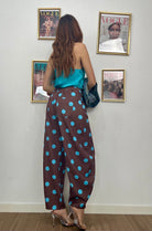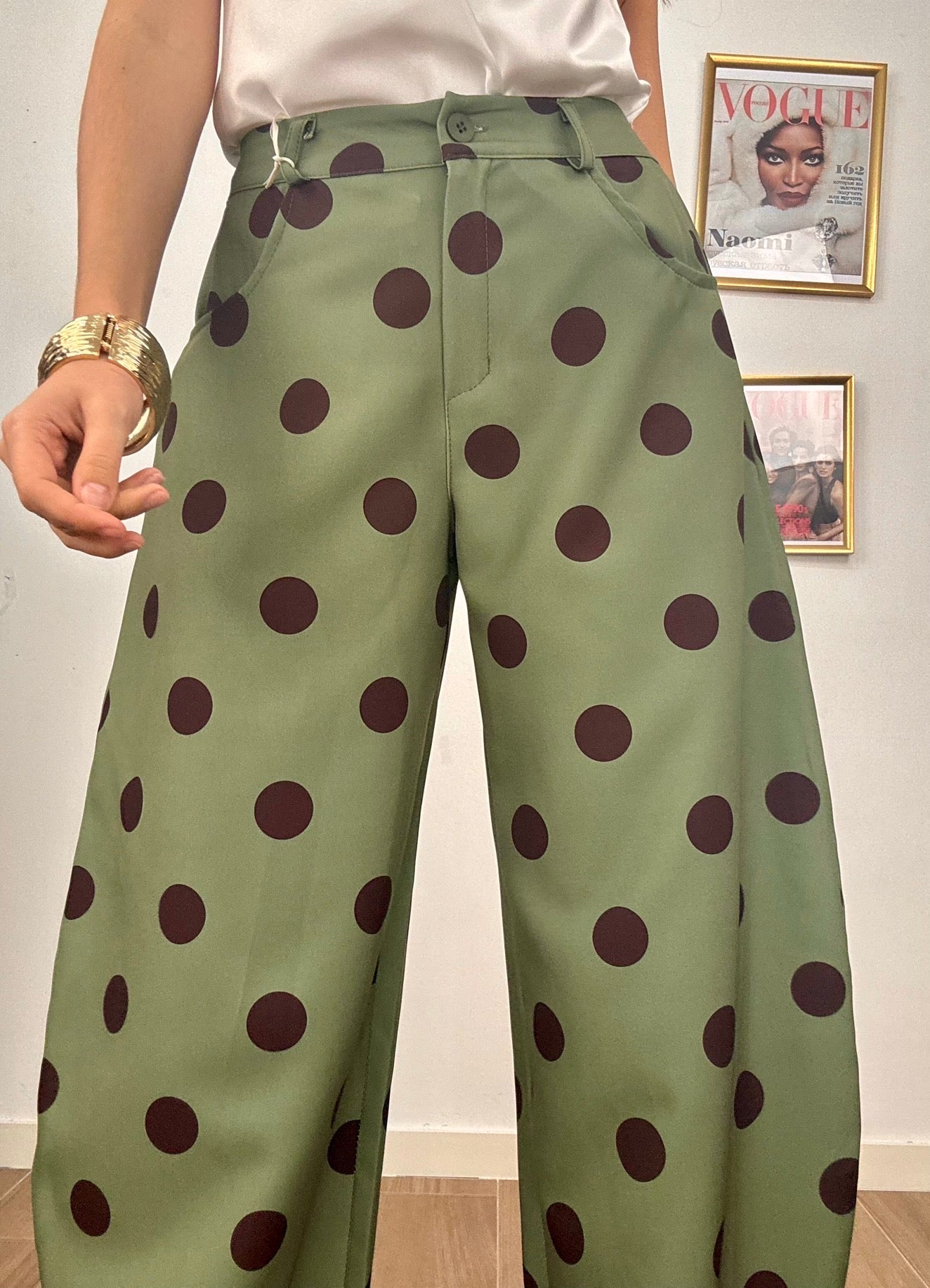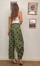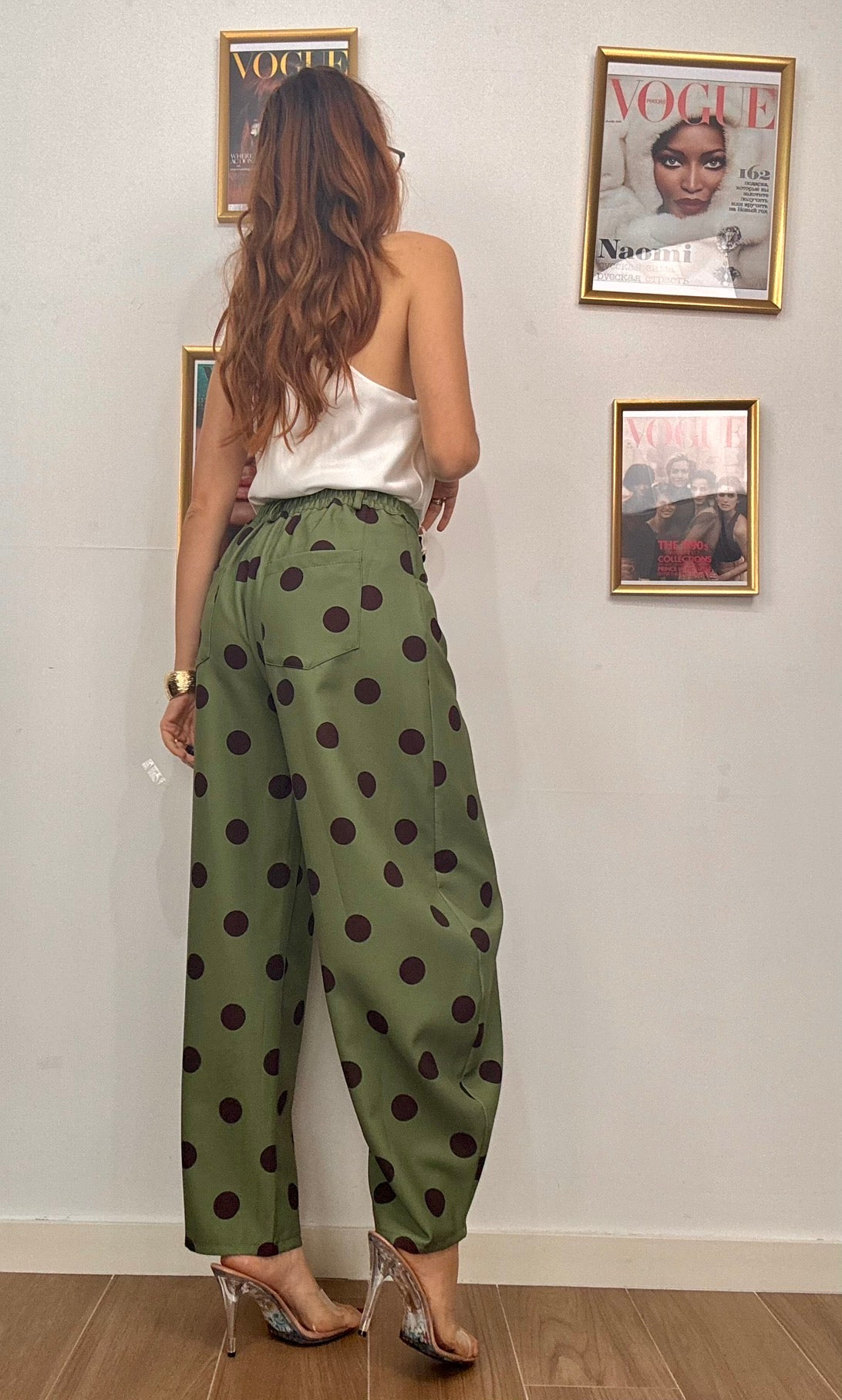 Pantalone modello balloon a vita alta con affascinante fantasia a pois. Tagliato in taglia unica che si adatta perfettamente anche a una L, garantendo una vestibilità comoda e lusinghiera. Disponibile in tre varianti di colore per adattarsi al tuo stile personale. Un capo versatile e raffinato per chi ama i dettagli classici con un tocco di carattere.
