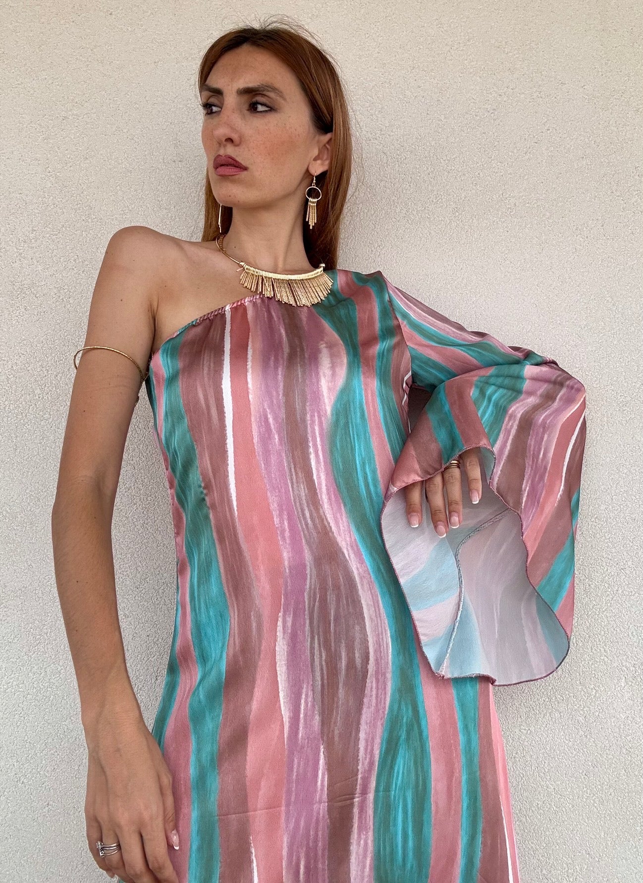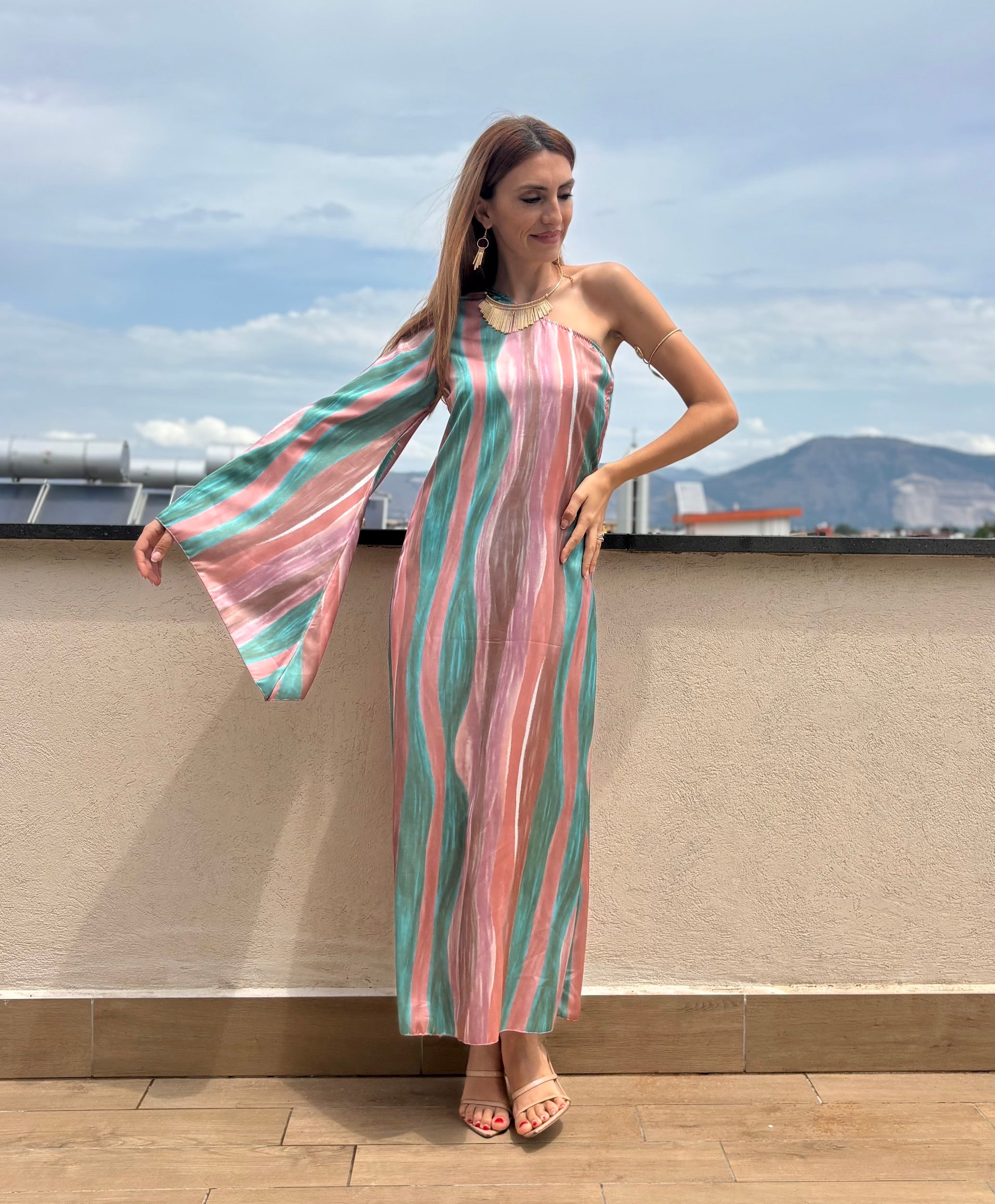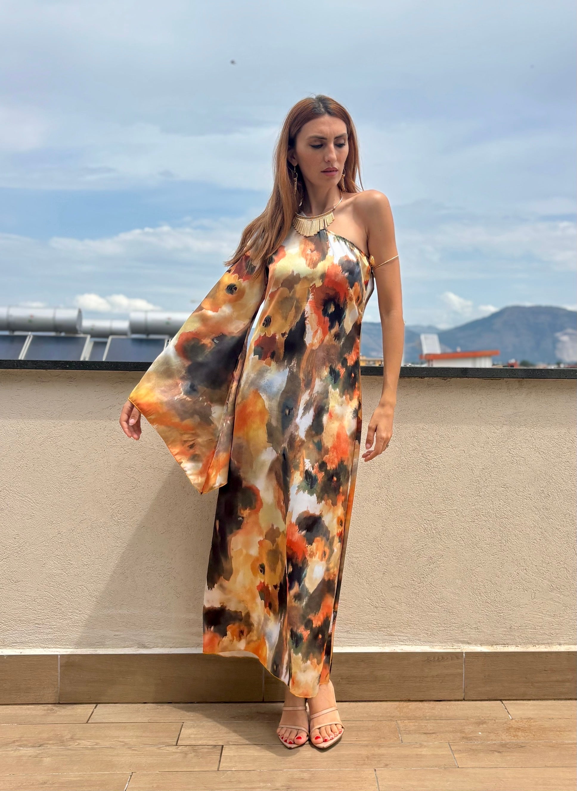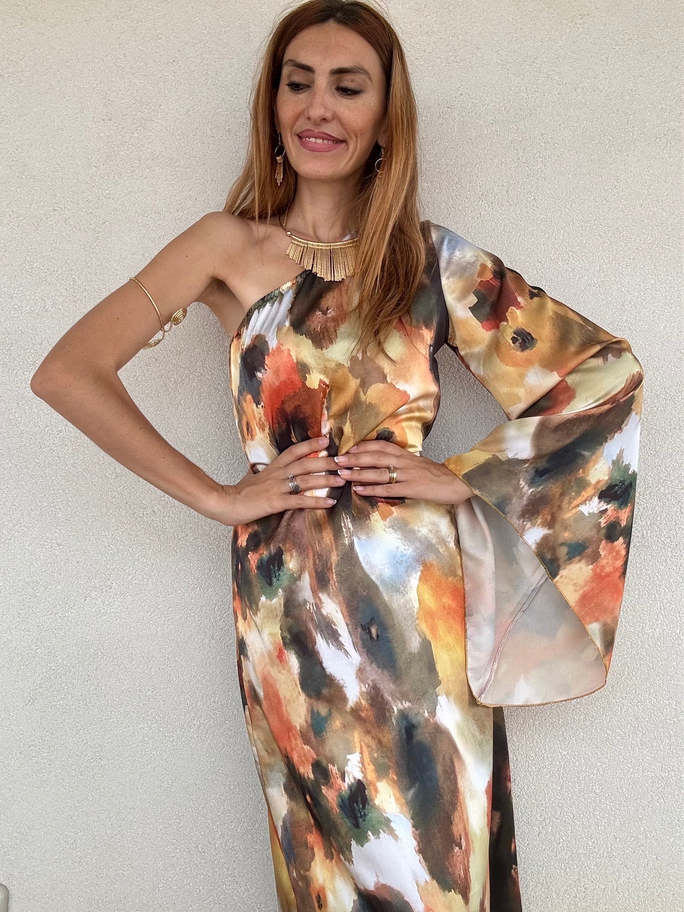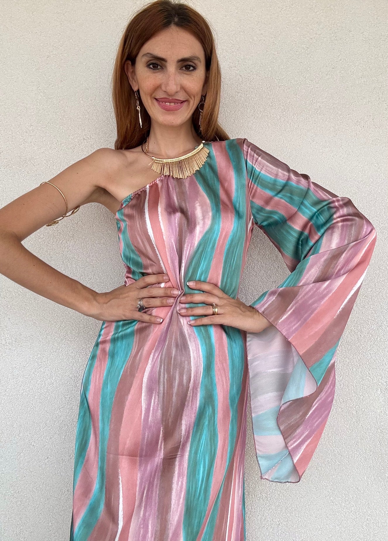 Scopri l'eleganza dell'Abito Caterina, un vestito lungo monospalla in simil raso che avvolge la silhouette con grazia. La manica a campana aggiunge un tocco di raffinatezza e movimento, mentre la taglia unica si adatta comodamente fino ad una L. Disponibile in due colori sofisticati, è la scelta perfetta per ogni occasione speciale. Scegli stile e comfort con questo capo versatile e femminile.