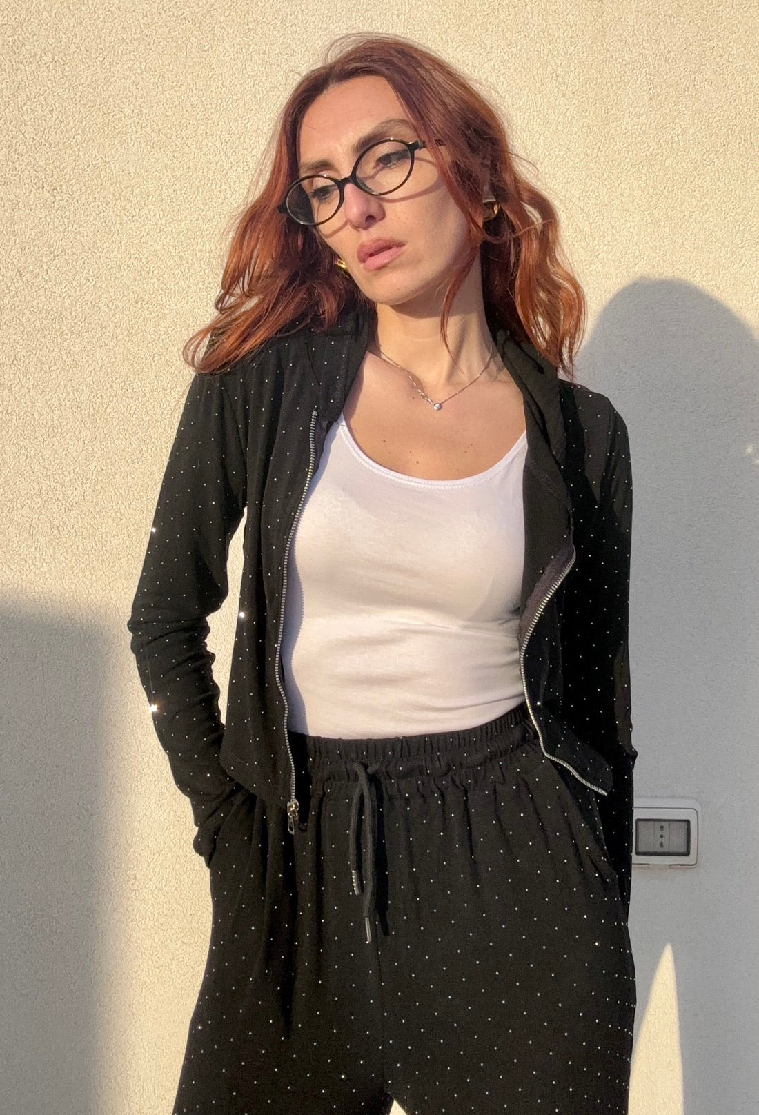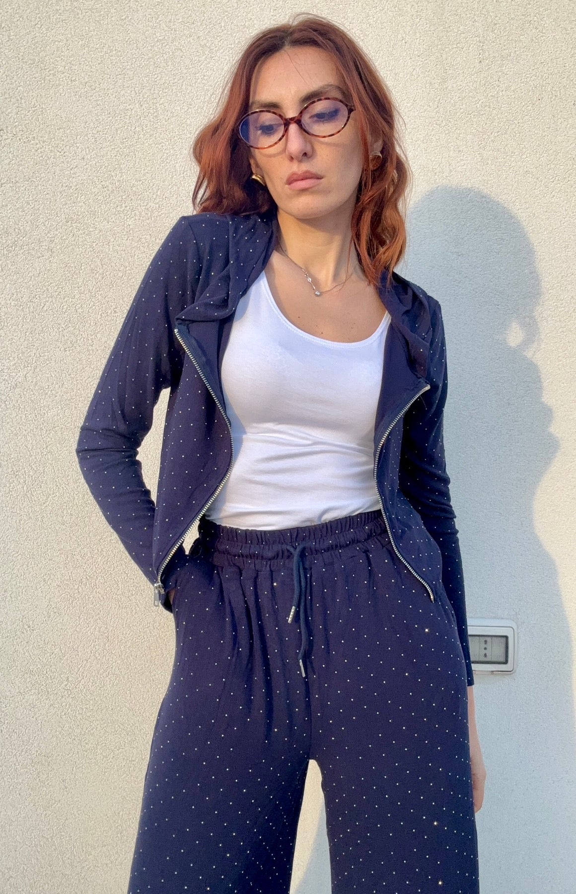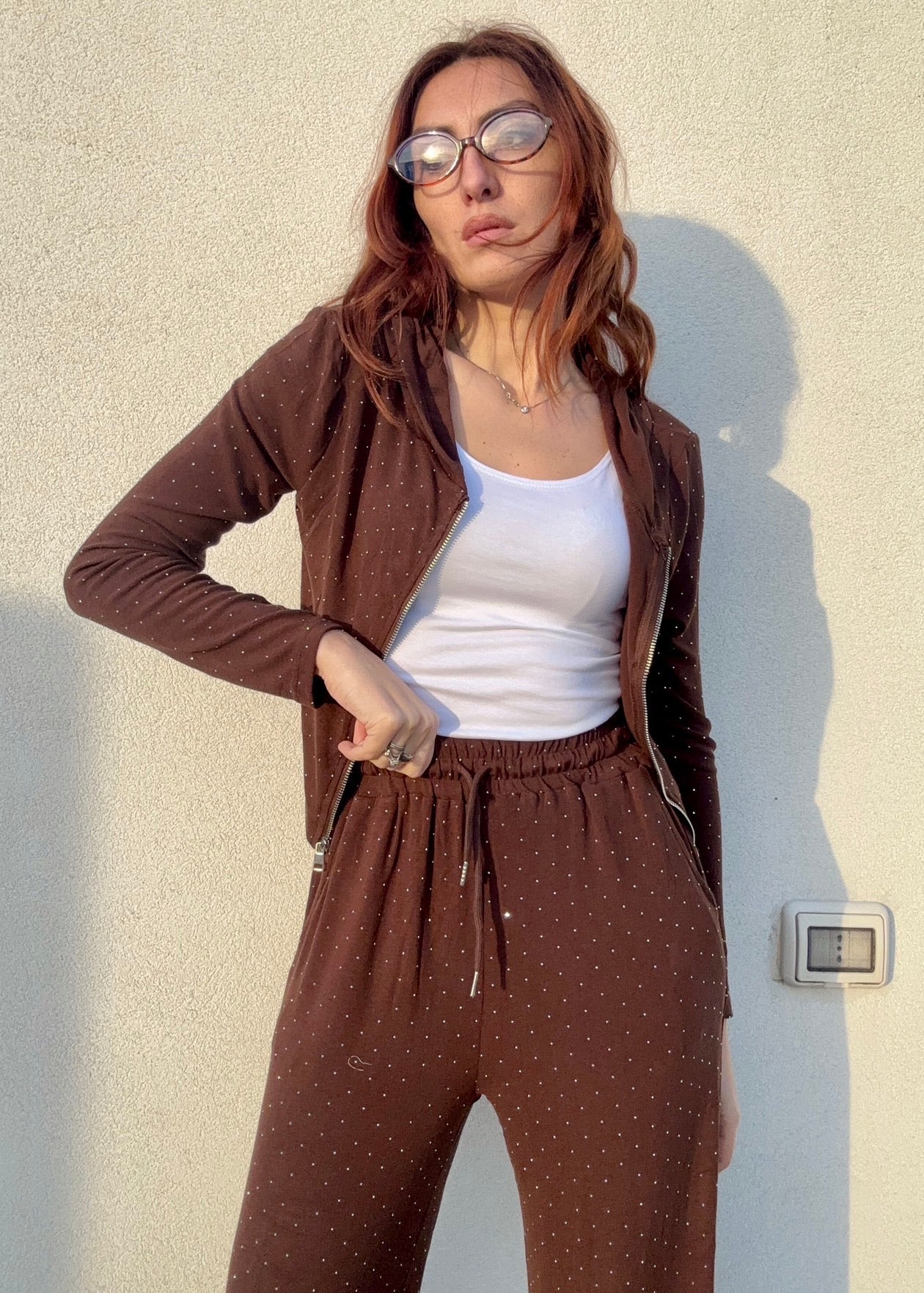 Coordinato elegante 95% Cotone composto da pantalone e felpa impreziositi da strass scintillanti che catturano la luce ad ogni movimento. La taglia unica si adatta perfettamente anche a chi indossa una L, garantendo una vestibilità comoda e lusinghiera. Disponibile in quattro varianti di colore per esprimere il tuo stile personale. Un set versatile che trasforma il casual in sofisticato, perfetto per chi desidera un look curato senza compromessi sulla comodità.